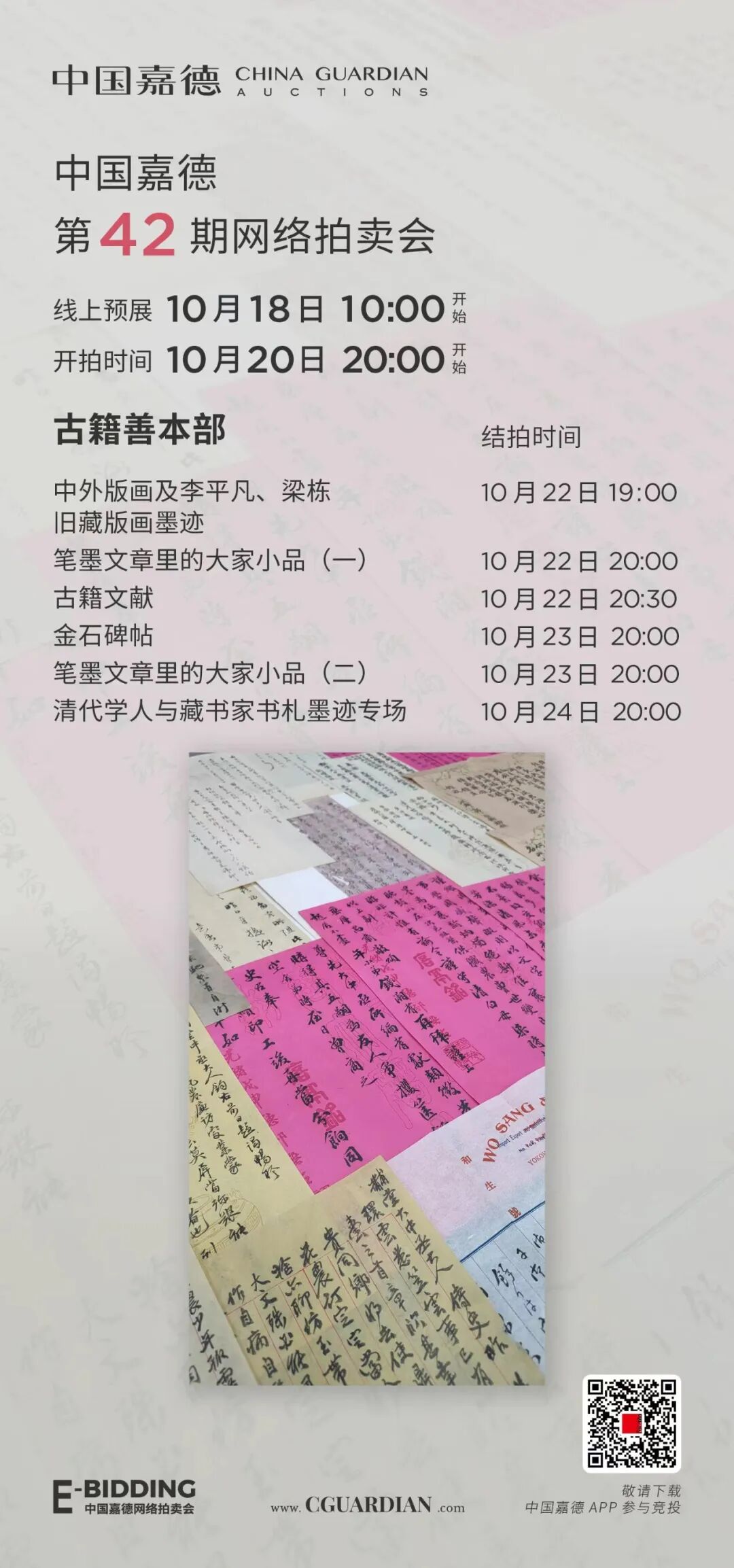 ●请您于参与拍卖活动当日24小时前完成账户注册并交纳保证金。●E-BIDDING提供预约鉴赏服务,敬请关注“中国嘉德网拍”服务号预约。鉴赏地点:嘉德艺术中心B1、B2层(北京市东城区王府井大街1号)。●中国嘉德为竞买人提供查看拍卖标的实物的条件,务请竞买人亲自审看。本公司对拍卖标的不承担瑕疵担保责任。请拨打1501000622015910807786中国嘉德国际拍卖有限公司(总部)