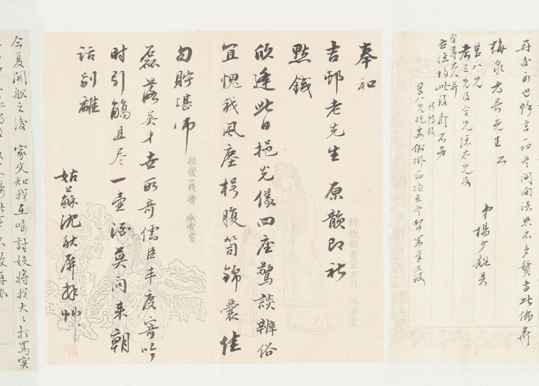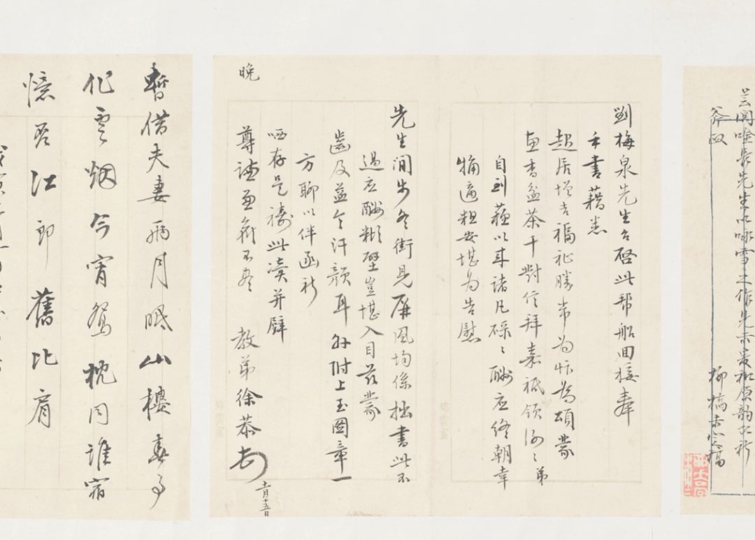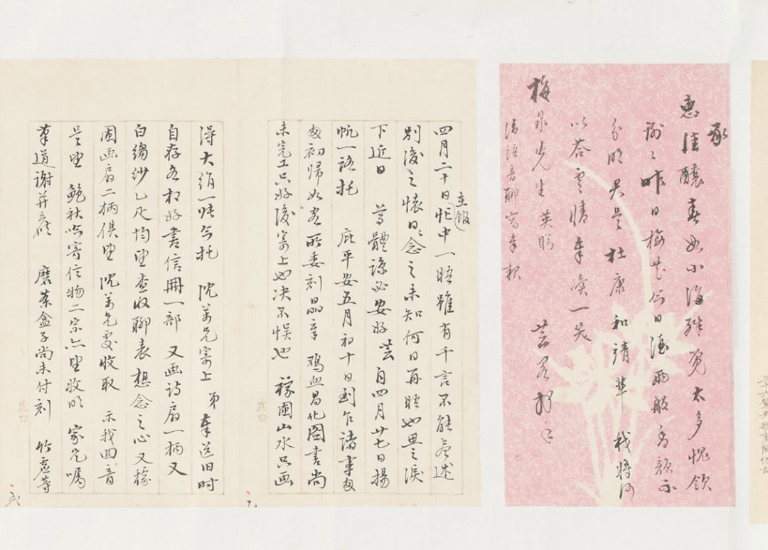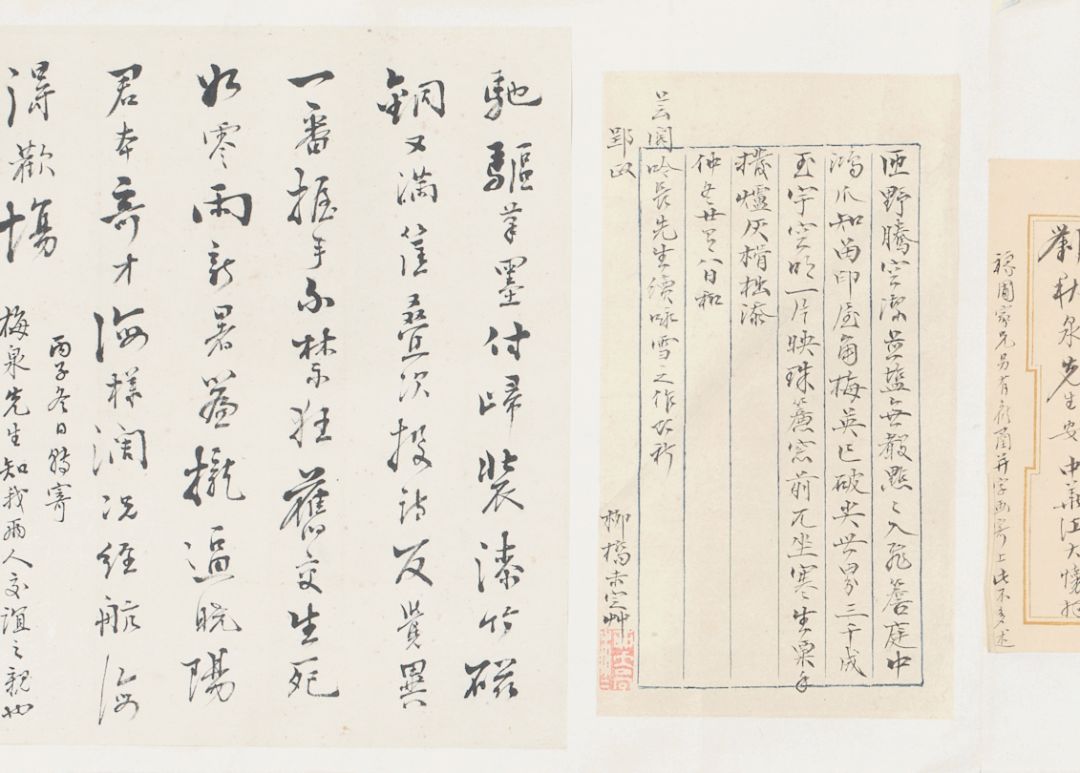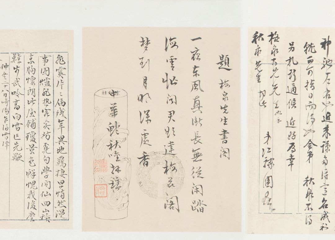 18、19世纪,清朝与日本德川幕府均奉行严格的闭关锁国政策,厉行海禁,仅开放长崎、宁波等部分港口作为通商口岸。在这样闭塞的环境下,往来两国之间的清朝商人承担起两国间文化交流的责任。江芸阁便是一位往返于宁波与长崎之间的文化商人,其在江户、明治时代的日本诗坛颇负盛名,且留下不少唱和之作、诗文评点、题画诗及签名等。此长卷为清季嘉道年间,清客江芸阁、江稼圃兄弟及朱柳桥、刘讷君(景筠)、陆品三等致日本长崎游龙彦次郎,以及清客之间信札及唱和诗作等共计41件,落款人多达17位。钤印:吟遍天涯、哲启事、云槎、芸阁、愿学、品三、秋屏、景筠、片玉、随缘、大槐之印、为美为古、柳桥、碧琳琅馆、静岩、吴门、放情诗酒、余事、鲍家诗句、秋唫便牋、秋唫主友、双铁居士、煮石山房、哲江芸阁(清),名大楣,字辛夷,号芸阁,别号印亭、玉壶生、十二瑶台使等。江苏苏州人。擅书法,通晓风雅之道,著有《竹枝词》。江芸阁随兄赴日,据载其共计东渡13次,初次赴日为1814年,赖山阳、梁川星岩、田能村竹田等与其交游甚多。江稼圃,名大来,字泰交,号稼圃。江芸阁兄。乾隆时期著名画家,因科举不第,跨海东游日本,与伊孚九、张秋谷、费晴湖并称渡日四大家,对日本画坛影响深远。朱柳桥,名栩平,字柳桥。浙江乍浦(今属嘉兴平湖)人。曾做过官,不久弃官行贾,往来于乍浦与长崎之间。他能诗擅画,知道中国士人的情况,经常贩运文献典籍,沟通两国知识分子之间的交流。刘梅泉即游龙彦次郎,曾为唐通事,先祖从中国大陆前往日本。本期呈现一组致孤山小盘谷西泠寓斋主人李桓、李辅耀父子书札11通。湘阴李家累代为官,李桓父李星沅为江苏巡抚,李桓曾官至江西巡抚之高位,后因与曾国藩不和,弃离官场,专志读书著述,游览名胜,以文学名家,撰清代传记巨著《国朝耆献类征初编》。光绪二年(1876),其子李辅耀以道员发浙江,次年李桓随子就养杭州。李辅耀宦游浙江30余年,三任杭嘉湖道员。李公秉承家风,博学多才,在公务之暇,随父在杭结识了许多文化名流。此组书札落款者分别为金安清、俞樾、李肇增、王廷鼎、潘衍鋆、许溎祥、钱溯耆、施启宇、徐人骥、丁立诚、许星箕,诸位多生于吴并官吴地,亦有与李氏同乡者,笔墨间自以煮茗清谈、诗酒流连为主。金安清(1817-1880),原名国琛,字眉生,号傥斋、销英道人。浙江嘉善人。清道光二十二年(1842)赴河南祥符治水,得林则徐举荐。太平天国军兴,佐胜保镇压太平军,充营务处,迁两淮盐运使。咸丰十年(1860)署江苏按察使,后被劾免职。入曾国荃幕,出谋划策,深得曾国荃、曾国藩器重。同治十年(1871)因劝捐有功,赏复原官阶。著有《水窗春呓》《筹洋三策》等。李桓(1827-1892),字叔虎,号黼堂、辅堂、桐华吟舫主人、桐华道人。湖南湘阴(今汨罗)人。李星沅第三子。官至江西布政使、巡抚,为镇压太平军筹措粮饷,政绩颇著。饱学诗书,以文学名家,亦工书法。著有《国朝耆献类征初编》《宝韦斋类稿》《海粟楼书目》。俞樾(1821-1906),字荫甫,号曲园。浙江德清人。清道光三十年(1850)进士,历任编修、河南学政。治学以经学为主,旁及诸子、史学、训诂、戏曲、诗词,被尊为朴学大师。擅书法,尤工大字。钱溯耆(1844-1917),字籥龢,号伊臣、听邠。江苏太仓人。清湖南巡抚钱宝琛孙、河南巡抚钱鼎铭子。恩赏主事,官直隶深州知州。李辅耀(1848-1916),字幼梅,号和定、和定居士、定叟。湖南湘阴人,父李桓。清同治九年(1870)优贡,光绪间先后任杭嘉湖道、宁绍台道、省防军局总办、温州盐厘金局监理等职。诗书画印无所不精,曾于杭州孤山“小盘谷”置地筑墅,取名“西泠寓斋”,即今“西泠印社”。著有《读礼丛钞》《返魂词》等。