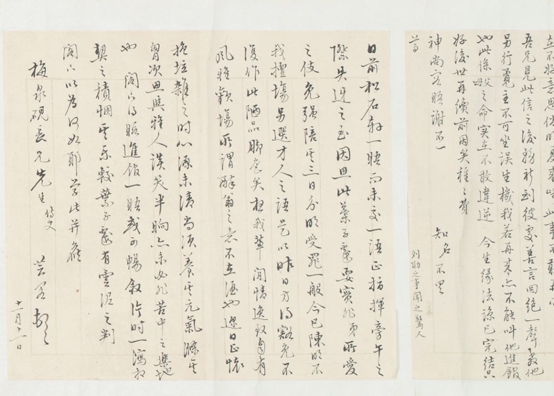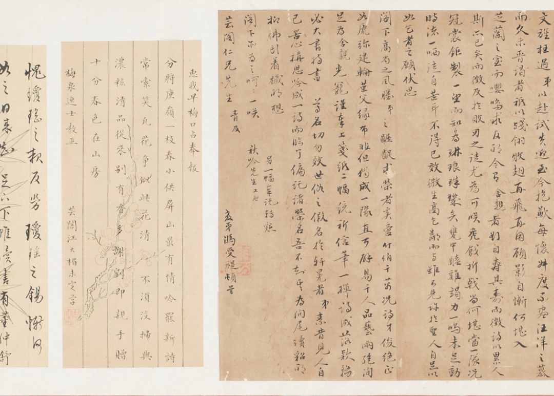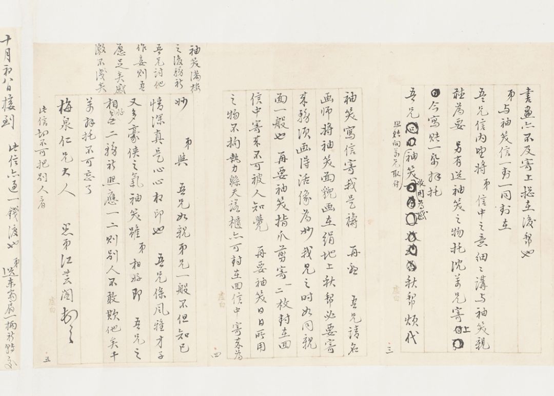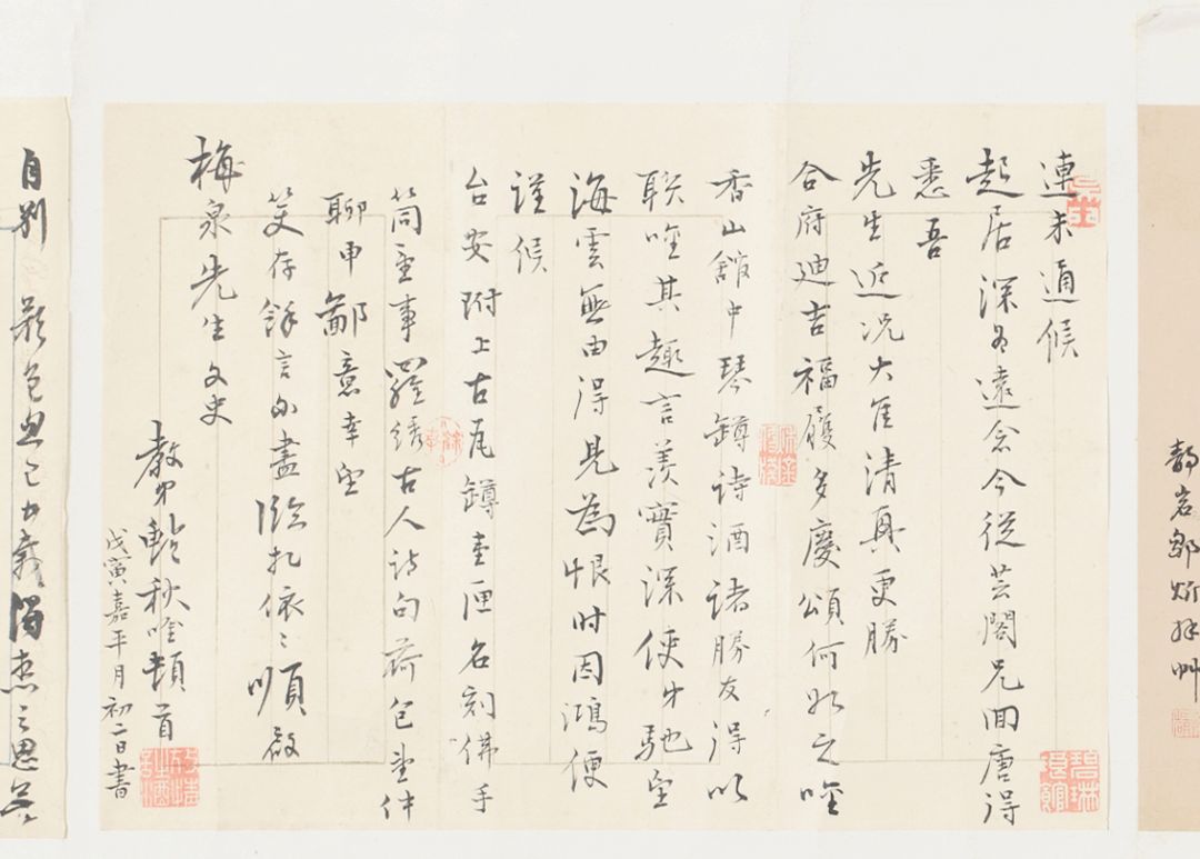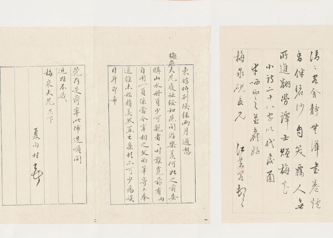 18、19世纪,清朝与日本德川幕府均奉行严格的闭关锁国政策,厉行海禁,仅开放长崎、宁波等部分港口作为通商口岸。在这样闭塞的环境下,往来两国之间的清朝商人承担起两国间文化交流的责任。江芸阁便是一位往返于宁波与长崎之间的文化商人,其在江户、明治时代的日本诗坛颇负盛名,且留下不少唱和之作、诗文评点、题画诗及签名等。此长卷为清季嘉道年间,清客江芸阁、江稼圃兄弟及朱柳桥、刘讷君(景筠)、陆品三等致日本长崎游龙彦次郎,以及清客之间信札及唱和诗作等共计41件,落款人多达17位。钤印:吟遍天涯、哲启事、云槎、芸阁、愿学、品三、秋屏、景筠、片玉、随缘、大槐之印、为美为古、柳桥、碧琳琅馆、静岩、吴门、放情诗酒、余事、鲍家诗句、秋唫便牋、秋唫主友、双铁居士、煮石山房、哲江芸阁(清),名大楣,字辛夷,号芸阁,别号印亭、玉壶生、十二瑶台使等。江苏苏州人。擅书法,通晓风雅之道,著有《竹枝词》。江芸阁随兄赴日,据载其共计东渡13次,初次赴日为1814年,赖山阳、梁川星岩、田能村竹田等与其交游甚多。江稼圃,名大来,字泰交,号稼圃。江芸阁兄。乾隆时期著名画家,因科举不第,跨海东游日本,与伊孚九、张秋谷、费晴湖并称渡日四大家,对日本画坛影响深远。朱柳桥,名栩平,字柳桥。浙江乍浦(今属嘉兴平湖)人。曾做过官,不久弃官行贾,往来于乍浦与长崎之间。他能诗擅画,知道中国士人的情况,经常贩运文献典籍,沟通两国知识分子之间的交流。刘梅泉即游龙彦次郎,曾为唐通事,先祖从中国大陆前往日本。本期呈现一组致孤山小盘谷西泠寓斋主人李桓、李辅耀父子书札11通。湘阴李家累代为官,李桓父李星沅为江苏巡抚,李桓曾官至江西巡抚之高位,后因与曾国藩不和,弃离官场,专志读书著述,游览名胜,以文学名家,撰清代传记巨著《国朝耆献类征初编》。光绪二年(1876),其子李辅耀以道员发浙江,次年李桓随子就养杭州。李辅耀宦游浙江30余年,三任杭嘉湖道员。李公秉承家风,博学多才,在公务之暇,随父在杭结识了许多文化名流。此组书札落款者分别为金安清、俞樾、李肇增、王廷鼎、潘衍鋆、许溎祥、钱溯耆、施启宇、徐人骥、丁立诚、许星箕,诸位多生于吴并官吴地,亦有与李氏同乡者,笔墨间自以煮茗清谈、诗酒流连为主。金安清(1817-1880),原名国琛,字眉生,号傥斋、销英道人。浙江嘉善人。清道光二十二年(1842)赴河南祥符治水,得林则徐举荐。太平天国军兴,佐胜保镇压太平军,充营务处,迁两淮盐运使。咸丰十年(1860)署江苏按察使,后被劾免职。入曾国荃幕,出谋划策,深得曾国荃、曾国藩器重。同治十年(1871)因劝捐有功,赏复原官阶。著有《水窗春呓》《筹洋三策》等。李桓(1827-1892),字叔虎,号黼堂、辅堂、桐华吟舫主人、桐华道人。湖南湘阴(今汨罗)人。李星沅第三子。官至江西布政使、巡抚,为镇压太平军筹措粮饷,政绩颇著。饱学诗书,以文学名家,亦工书法。著有《国朝耆献类征初编》《宝韦斋类稿》《海粟楼书目》。俞樾(1821-1906),字荫甫,号曲园。浙江德清人。清道光三十年(1850)进士,历任编修、河南学政。治学以经学为主,旁及诸子、史学、训诂、戏曲、诗词,被尊为朴学大师。擅书法,尤工大字。钱溯耆(1844-1917),字籥龢,号伊臣、听邠。江苏太仓人。清湖南巡抚钱宝琛孙、河南巡抚钱鼎铭子。恩赏主事,官直隶深州知州。李辅耀(1848-1916),字幼梅,号和定、和定居士、定叟。湖南湘阴人,父李桓。清同治九年(1870)优贡,光绪间先后任杭嘉湖道、宁绍台道、省防军局总办、温州盐厘金局监理等职。诗书画印无所不精,曾于杭州孤山“小盘谷”置地筑墅,取名“西泠寓斋”,即今“西泠印社”。著有《读礼丛钞》《返魂词》等。