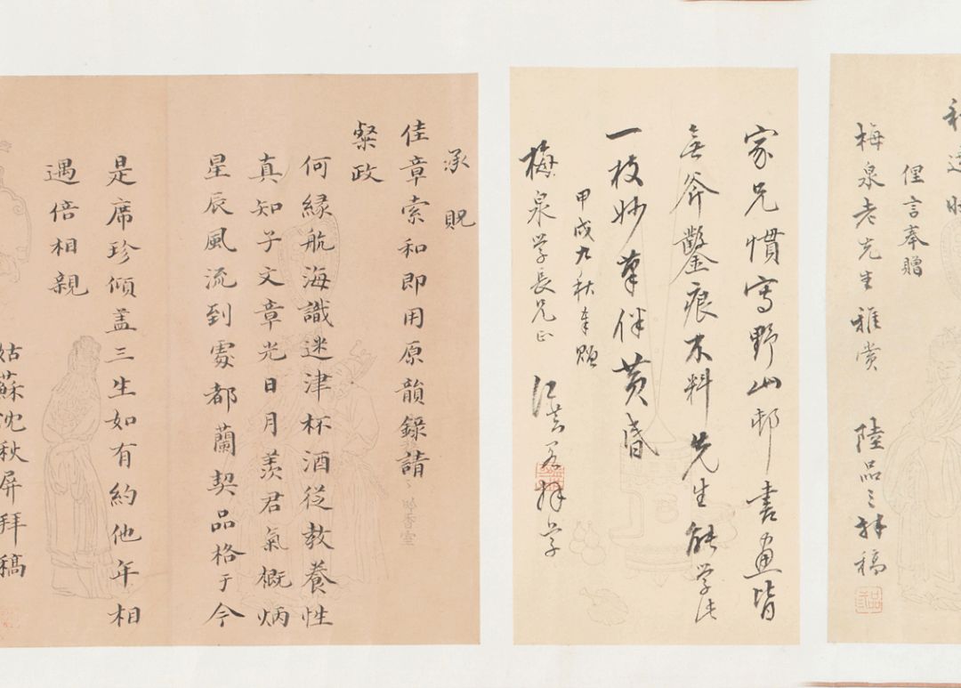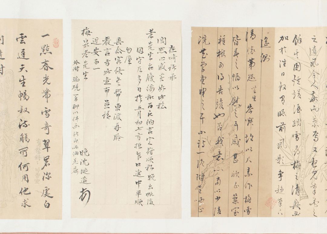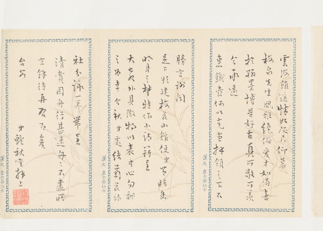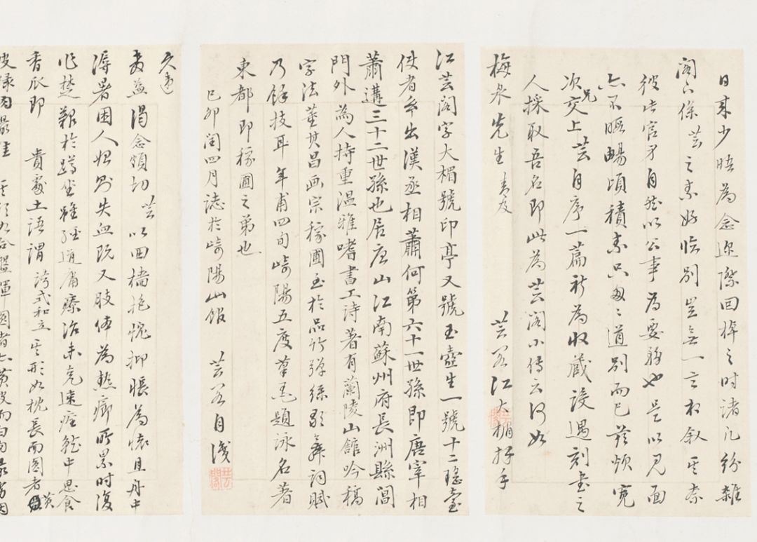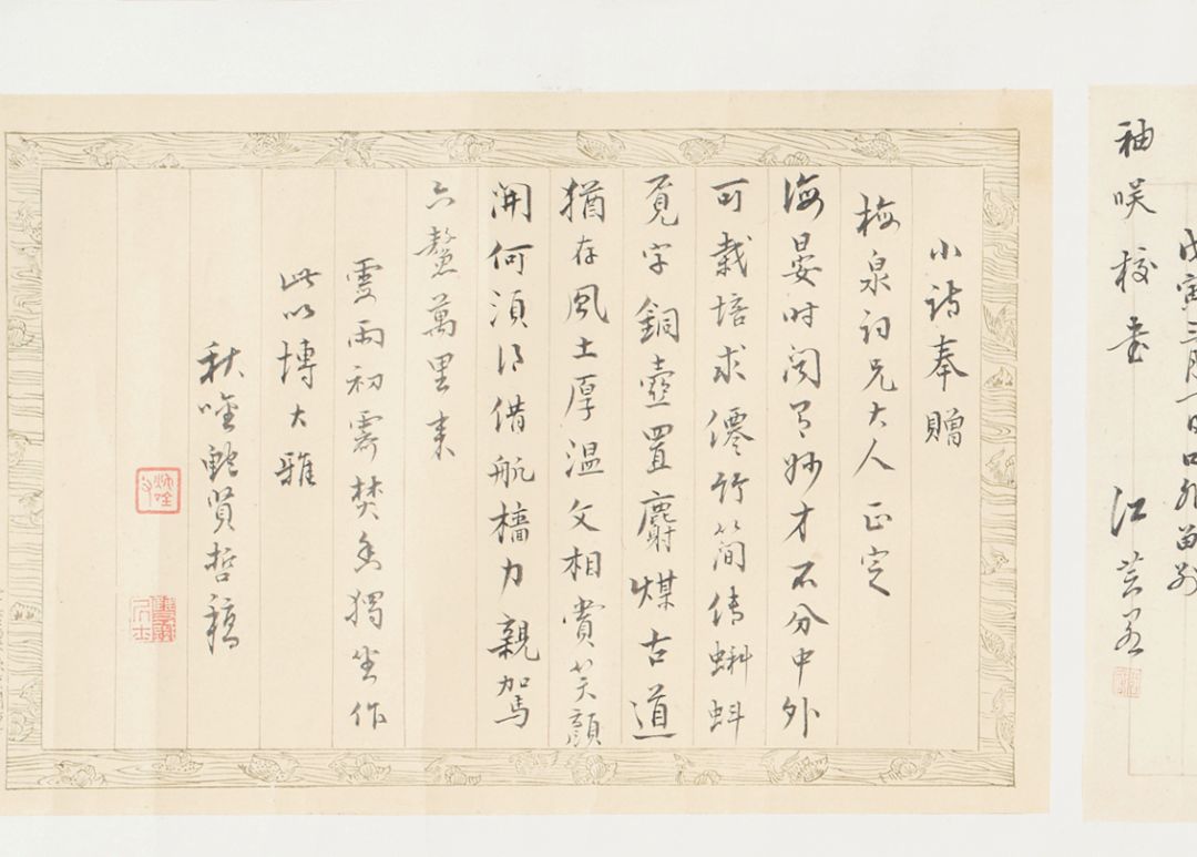 18、19世纪,清朝与日本德川幕府均奉行严格的闭关锁国政策,厉行海禁,仅开放长崎、宁波等部分港口作为通商口岸。在这样闭塞的环境下,往来两国之间的清朝商人承担起两国间文化交流的责任。江芸阁便是一位往返于宁波与长崎之间的文化商人,其在江户、明治时代的日本诗坛颇负盛名,且留下不少唱和之作、诗文评点、题画诗及签名等。此长卷为清季嘉道年间,清客江芸阁、江稼圃兄弟及朱柳桥、刘讷君(景筠)、陆品三等致日本长崎游龙彦次郎,以及清客之间信札及唱和诗作等共计41件,落款人多达17位。钤印:吟遍天涯、哲启事、云槎、芸阁、愿学、品三、秋屏、景筠、片玉、随缘、大槐之印、为美为古、柳桥、碧琳琅馆、静岩、吴门、放情诗酒、余事、鲍家诗句、秋唫便牋、秋唫主友、双铁居士、煮石山房、哲江芸阁(清),名大楣,字辛夷,号芸阁,别号印亭、玉壶生、十二瑶台使等。江苏苏州人。擅书法,通晓风雅之道,著有《竹枝词》。江芸阁随兄赴日,据载其共计东渡13次,初次赴日为1814年,赖山阳、梁川星岩、田能村竹田等与其交游甚多。江稼圃,名大来,字泰交,号稼圃。江芸阁兄。乾隆时期著名画家,因科举不第,跨海东游日本,与伊孚九、张秋谷、费晴湖并称渡日四大家,对日本画坛影响深远。朱柳桥,名栩平,字柳桥。浙江乍浦(今属嘉兴平湖)人。曾做过官,不久弃官行贾,往来于乍浦与长崎之间。他能诗擅画,知道中国士人的情况,经常贩运文献典籍,沟通两国知识分子之间的交流。刘梅泉即游龙彦次郎,曾为唐通事,先祖从中国大陆前往日本。本期呈现一组致孤山小盘谷西泠寓斋主人李桓、李辅耀父子书札11通。湘阴李家累代为官,李桓父李星沅为江苏巡抚,李桓曾官至江西巡抚之高位,后因与曾国藩不和,弃离官场,专志读书著述,游览名胜,以文学名家,撰清代传记巨著《国朝耆献类征初编》。光绪二年(1876),其子李辅耀以道员发浙江,次年李桓随子就养杭州。李辅耀宦游浙江30余年,三任杭嘉湖道员。李公秉承家风,博学多才,在公务之暇,随父在杭结识了许多文化名流。此组书札落款者分别为金安清、俞樾、李肇增、王廷鼎、潘衍鋆、许溎祥、钱溯耆、施启宇、徐人骥、丁立诚、许星箕,诸位多生于吴并官吴地,亦有与李氏同乡者,笔墨间自以煮茗清谈、诗酒流连为主。金安清(1817-1880),原名国琛,字眉生,号傥斋、销英道人。浙江嘉善人。清道光二十二年(1842)赴河南祥符治水,得林则徐举荐。太平天国军兴,佐胜保镇压太平军,充营务处,迁两淮盐运使。咸丰十年(1860)署江苏按察使,后被劾免职。入曾国荃幕,出谋划策,深得曾国荃、曾国藩器重。同治十年(1871)因劝捐有功,赏复原官阶。著有《水窗春呓》《筹洋三策》等。李桓(1827-1892),字叔虎,号黼堂、辅堂、桐华吟舫主人、桐华道人。湖南湘阴(今汨罗)人。李星沅第三子。官至江西布政使、巡抚,为镇压太平军筹措粮饷,政绩颇著。饱学诗书,以文学名家,亦工书法。著有《国朝耆献类征初编》《宝韦斋类稿》《海粟楼书目》。俞樾(1821-1906),字荫甫,号曲园。浙江德清人。清道光三十年(1850)进士,历任编修、河南学政。治学以经学为主,旁及诸子、史学、训诂、戏曲、诗词,被尊为朴学大师。擅书法,尤工大字。钱溯耆(1844-1917),字籥龢,号伊臣、听邠。江苏太仓人。清湖南巡抚钱宝琛孙、河南巡抚钱鼎铭子。恩赏主事,官直隶深州知州。李辅耀(1848-1916),字幼梅,号和定、和定居士、定叟。湖南湘阴人,父李桓。清同治九年(1870)优贡,光绪间先后任杭嘉湖道、宁绍台道、省防军局总办、温州盐厘金局监理等职。诗书画印无所不精,曾于杭州孤山“小盘谷”置地筑墅,取名“西泠寓斋”,即今“西泠印社”。著有《读礼丛钞》《返魂词》等。