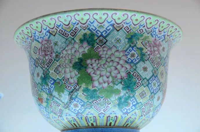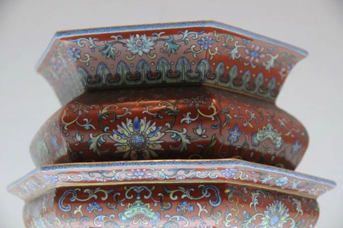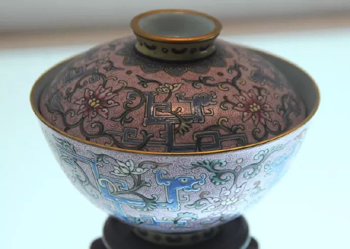 法轮是佛家八宝之一,象征佛法永不熄灭,像轮子一样旋转不停。此器施金釉,饰珐琅彩。中央八根菱形轮辐代表佛祖释家牟尼一生传教的八件大事。