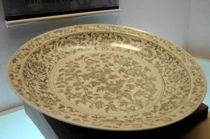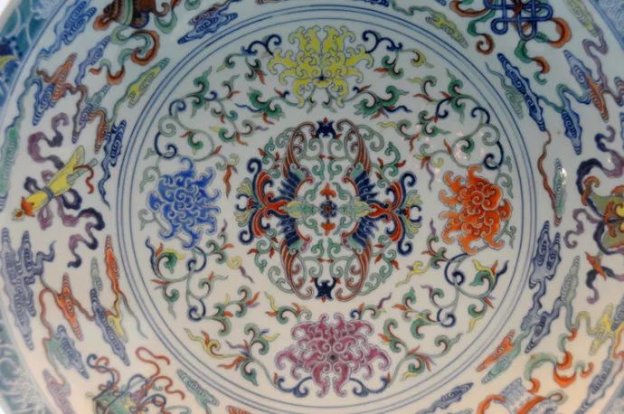 这件是瓷器展厅中口径最大的展品。与嘉靖皇帝信奉道教有关,盘的内、外壁都绘着具有道教色彩的纹饰。在盘的内壁口沿处绘着十二只翻飞的仙鹤和十二朵任字云,寓意长寿。