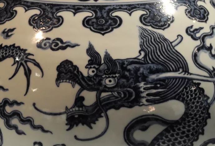 您看,它的造型据有伊斯兰教器物的特征,绘青花所用的颜料是产于今天伊朗的“苏泥渤青”料,特点是发色浓重,有铁质黑斑。在器物扁硕的腹部,对称绘着两条好像要腾飞而出的蛟龙。虽然器物上没有绘官窑款,但是腾龙尽显帝王之气。