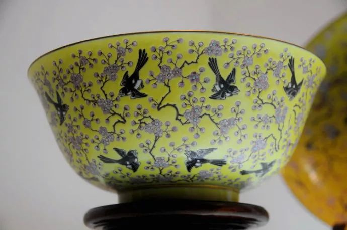 大雅斋瓷多以黄色、湖绿色为地;纹样都是寓意吉祥的花鸟纹,这件大雅斋瓷,流传有序,是鉴定大雅斋瓷的标准器。
