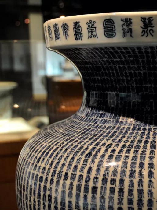 字的大小随器物的造型曲线伸缩,规整而自然,造作而有风韵。烧制如此硕大的器物,需要高超的烧瓷技术;如此明丽的青花发色,需要上等青花色料描绘;表现如此繁缛多姿的异体“寿”字要有深厚的文字功底;如此非凡的整体策划更显示出封建帝王的威势和臣子们的恭敬。