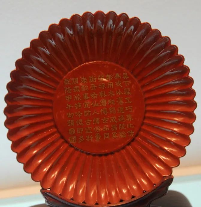 清乾隆仿朱漆釉金彩御题诗菊瓣纹盘