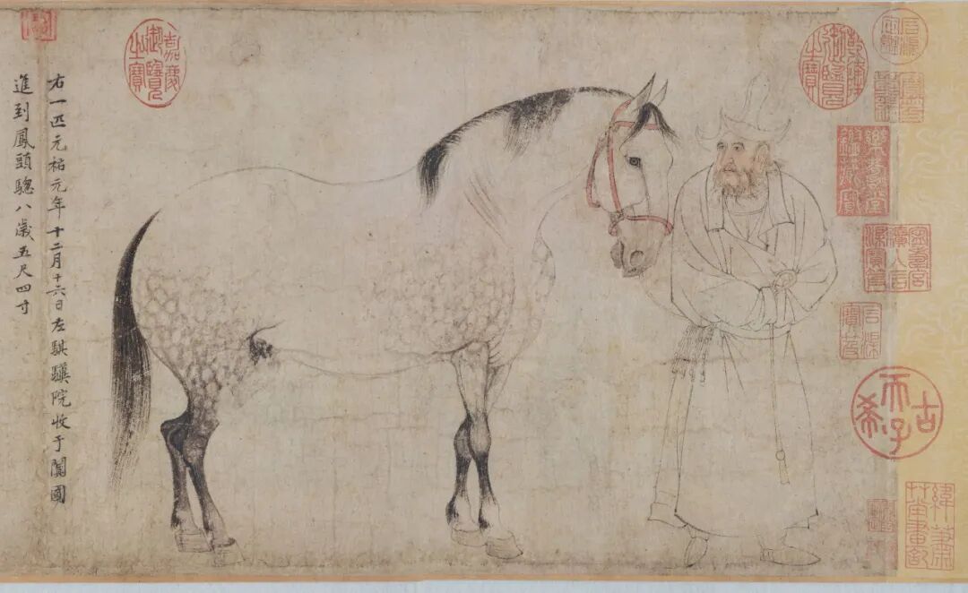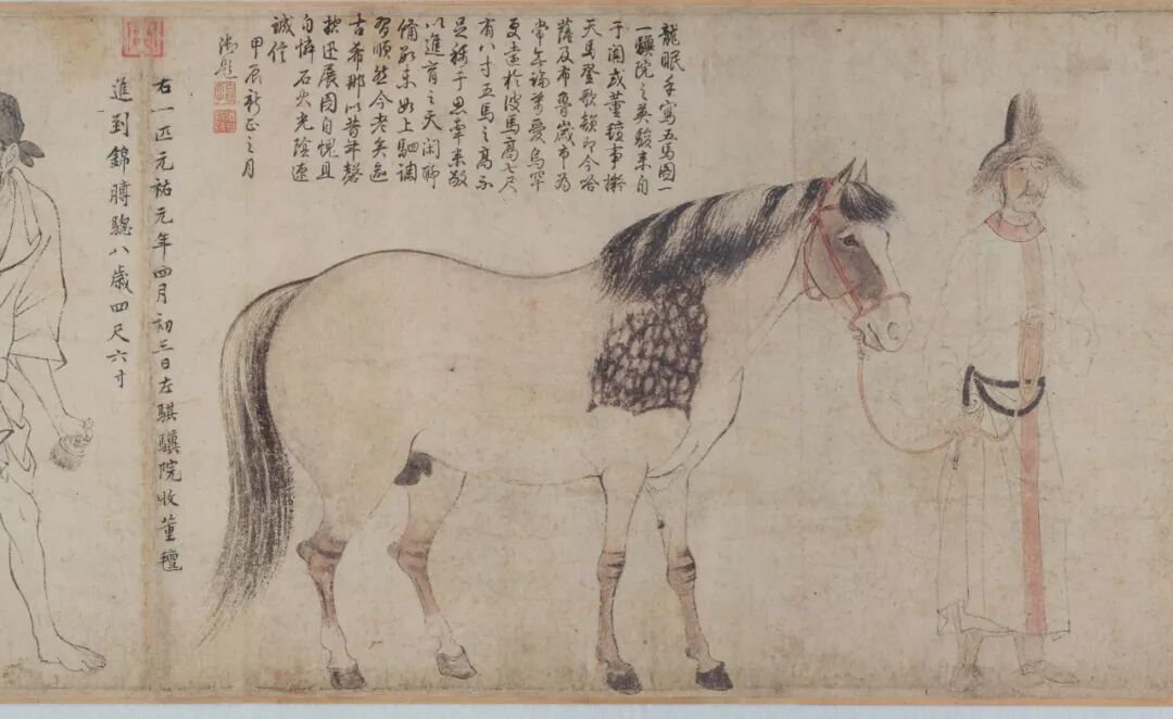 图源:东京国立博物馆官网它在中国本土最后的踪迹是在上个世纪,自溥仪将它带出北京故宫,卖与别人,流落日本后从此下落不明……甚至一度有传闻《五马图》早就毁于战火,令人为它的坎坷身世扼腕痛惜不已。直至2019年它在东京博物馆重见天日,震惊世人。今年(2022年)《五马图》再次现身东博可谓万众期待,据说展方为它进行了再次修复,不知道会呈现给观众什么样的新面貌。在东京的观众们眼福不浅,与它的相遇用“一期一会”形容也不为过!错过的话,不知要再等多少年了。总体来说,《五马图》作品流传有序,作者为北宋李公麟。他传世至今的确切真迹,很可能就只这件《五马图》。从这件作品中,倒也能追溯不少关于作者的小八卦。这位北宋时期的白描高手,其画技在包括苏轼在内牛逼闪闪的元祐文人们心目中,公认为顶级。元祐文人圈的日常文艺座谈会中,就包含了“李公麟作品赏析”的环节,来往酬唱诗文至今仍留下不少。《西园雅集图》中,北宋诸名流们变身粉丝团围在李公麟身边,星星眼N脸崇拜地看他画画,可谓是真实写照。李公麟钟情画马,苏轼说“龙眠胸中有千驷”,一语道出他的画马水平,也侧面反映这位朋友有多么喜欢马。而有点小迷信的黄庭坚,还相信李公麟的画马出神入化,他言辞凿凿说过一个关于李公麟以画夺命的小八卦。按黄庭坚的说法,李公麟画马儿,那是摊上了马命的——这就是“画杀满川花”的传说。曾纡在《五马图》的画跋中,写到了这个离奇事件。有一年,曾纡遇到了李公麟的同僚好友黄庭坚,黄庭坚告诉他:太奇怪了,伯时画御马满川花,停笔后马儿居然死了。(“异哉,伯时貌天厩满川花,放笔而马殂矣。”)于是得出结论,一定是这神骏的精气魂魄,被李公麟的画笔夺走了。(盖神骏精魄,皆为伯时笔端取之而去。)无独有偶,在宋徽宗朝编的《宣和画谱》中也有过类似的记载:“(李公麟)尝写骐骥院御马,如西域于阗所贡好头赤、锦膊骢之类,写貌至多,至圉人恳请,恐并为神物取去。”意思是说,当年照顾贡马的圉人就差跪下,恳请李公麟笔下留马命啊,别再画西域进贡的骏马,他们担心御马好头赤、锦膊骢的魂魄“为神物取去”——怕被李公麟的笔杀死。也是奇怪吼,当年人们是没有考虑过西域马儿到中原水土不服这个选项的,大家好像真的相信,李公麟的笔下神力高深,能夺走马命!这个传说和张僧繇画龙点睛后“龙乘云腾去上天”、韩干把马画活等神异事件一起,组成了令文人津津乐道的历代画届不可思议传说。传闻真假暂且不论,至少在《五马图》中,被“画杀”的满川花,以及“恐并为神物取去”的好头赤、锦膊骢,这些故事中的马主角们“马魂不散”,都活蹦乱跳站在人们眼前!黄庭坚为马儿们题写了简单的姓名、籍贯、身高、年纪,画后还留下跋文,为我们认识这几位马主角们提供了档案。黄庭坚题识为:【右一匹,元祐元年十二月十六日,左麒麟院,收于阗国进到凤头骢,八岁,五尺四寸】按黄庭坚留下的题字,凤头骢身高五尺四寸,按宋尺合高度约1.67米,是《五马图》记有身高资料的三匹马儿中,身量最高的马中超模!它膘肥体壮肌肉匀称,这身高身材十分罕见。身旁的奚官注意力都在凤头骢身上,想必平时对它的照料十分细心。凤头骢四肢的重心也非常均衡,姿态优美,一看就是平时训练有素,它这时候的情绪看起来也很稳定,综合素质来说绝对是宝马中的第一梯队。黄庭坚题识为:【右一匹,元祐元年四月初三日,左麒麟院,收董毡进到锦膊骢,八岁,四尺六寸】