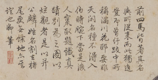 照夜白和传闻中唐玄宗的宝马“照夜白”撞名,它只有年份记录,通体雪白,和其余四马都不同的是,照夜白的马尾微微飘动,正和奚官并排踏步往前走,走位灵动十分乖巧。有没有发现,它的行走步伐和奚官的步伐也基本一致,灵气逼人,这一马一人堪称本图中默契最好的一对。满川花的名字来源于身上散落的不规则花斑,犹如繁花飘满山川,寓意甚美。这只马儿的题识已经失传,很可能清代以前早就被人裁去。于是乾隆皇帝对满川花也很不客气,写了一段质疑它身份的“小作文”,大剌剌盖在马背上方,他认为真正大名鼎鼎的满川花,怕是被人移花接木,和四只假马“别为之图”,被拼成另外一幅伪作了。即使常被人质疑是否李公麟亲笔所画,但这只在传闻中被李公麟亲笔霍霍了性命的满川花,优雅的身姿也非常值得瞩目。它是五马中唯一偏过正脸,看向画外的马,风姿潇洒,目光温柔,颇通人性。▲满川花背上留下的乾隆御笔:【前四马皆著其名与所从来,而此独逸,岂即曾纡跋中所称满川花耶?要非天闲名种不得入伯时腕下,当是后人窜取题识真迹别为之图,以炫观者,是以并公麟姓名割去楮尾,更无馀地,亦其证也。御笔。】《五马图》的骏马采用单线白描,局部简单渲染,线条走势流畅,头颈至背部线条几乎是一气呵成,画家以细腻简淡的笔触,就把各宝马的体态色泽、细微的肌肉线条、鬃毛分量表达出来。尤其是每匹马的神态微表情都各不相同,唇角的勾弧,眼部轮廓,马背俯仰的幅度,都微妙传递出它们各自的性情状态,刻画入骨。李公麟白描人物也非常厉害,在人物画上,李公麟博采众家之长,他把顾恺之、陆探微、吴道子等画人物的前辈高手都学了个遍,《五马图》中蓬松灵活的人物和衣褶线条,自如勾勒出沉静内敛或潇洒不羁的人物气质。《宣和画谱》还提到他画人物是“能分辨状貌”。大意是说,他画的人物能像现实人物一样,呈现出不一样的状貌。《五马图》中的人物就面目不一,三位西域奚官的脸部轮廓明显异于中土人士,而且带有非常显著不同的地域特点。近千年前的宋代,艺术家们还没有像西方文艺复兴时期,形成人体解剖知识,把画画作为业余兴趣的李公麟仅凭肉眼观察和线条构造,就呈现出这样的硬核写实程度,确实是十分了不起的!纵观整个宋代很难有人与之匹敌。也完全能理解,直到元末明初,夏文彦在《图绘宝鉴》依然夸李公麟能打程度宋代第一:“(李公麟)当为宋画中第一,照映前古者也。”不说其他托名为李公麟的作品,就《五马图》的白描水平来说,这个流畅娴熟得近乎自然天成的线条造型水平,放到今天来看依然非常惊艳,非常洗眼睛。只谈白描这一科,他完全担得起“宋画第一”。在李公麟之前,白描画其实多为用来制作壁画的底稿,正是因为李公麟白描艺术水平高,从他开始,白描不再是艺术家们的备选项,开始逐渐变为一门独立成科的艺术。而他“吾为画,如骚人之赋诗,吟咏性情而已”的发声,也是宋代文人画“诗画一体”的代表心声。李公麟笔下马的身价,当年一度可能比买一匹真马还高出很多,北宋《冷斋夜话》提到当时有一种说法:“都城黄金易得,而伯时马不可得。”但这可能和李公麟后来不再画马,“人为制造”的市场稀缺也有关系。有高僧对他说,你这辈子画马过多,过于痴迷,下辈子恐怕会“堕入马趣”,意思是告诫他会转生变成马。传说从那以后,李公麟就转向画佛道人物了。再想买到他画的马,那真是跪下求也没用了。只不过呢,历史还是和李公麟开了个小玩笑,他最终留下最广为人知的杰作,依然是他笔下的马主角们——《五马图》。到现在一千年了,咱李哥还是脱离不开和马的缘分啊!当人们谈论李公麟时,一定会谈论他画的马。不过,从某种角度来说,当年高僧说的话倒也没错,沉迷堕入李公麟制造的“骏马趣味”的,其实是咱广大观众吧!黄小峰:《重访<五马图>》,《美术研究》2019年04期顾海涛:《李公麟绘画研究》,中国艺术研究院博士学位论文衣若芬:《画杀满川花 画马异事的神秘与超越》,《紫禁城》2014 年第1期