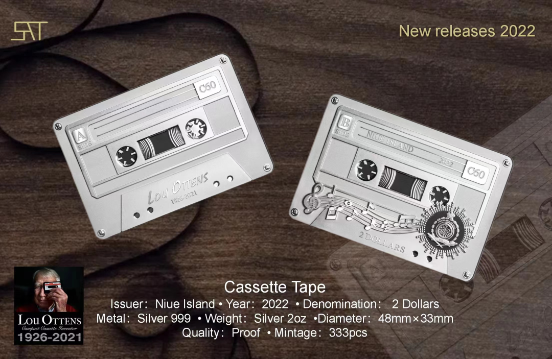 这个月,纽埃发行了一枚磁带银币!币面值为2Dollar,含纯银2盎司,全球限量发行仅333枚。这枚银币采用独特少有的磁带盘样式,圆角矩形,结合浮雕、镜面等工艺,实物满满的怀旧感!▲点击观看视频