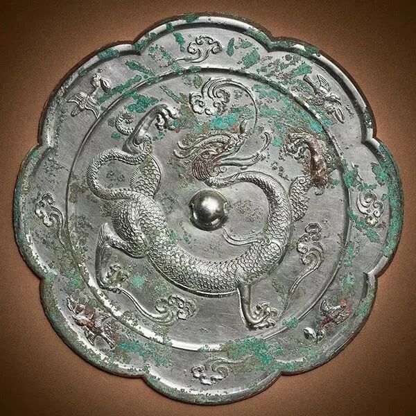 唐 海兽葡萄纹铜镜随着铸造技术的发展,唐代铜镜手工艺人受到波斯萨珊王朝的造型艺术影响,在铜镜制作中打破了传统的造型,出现了各式各样的花形镜,成为铜镜中的一道绚丽风景。![]()