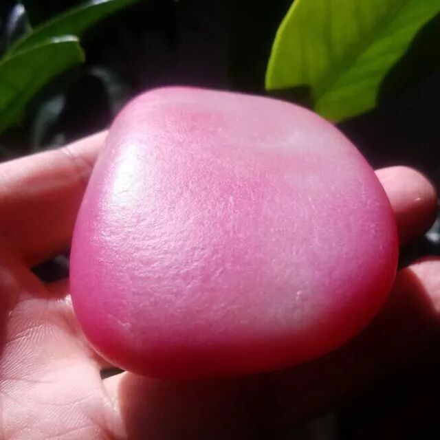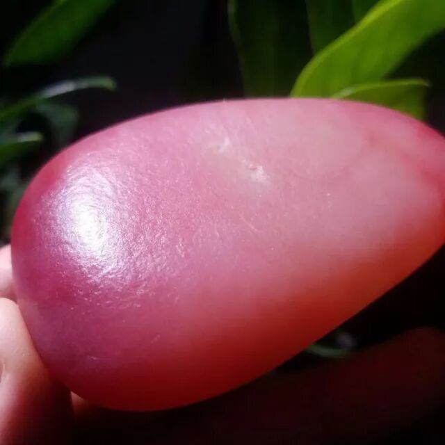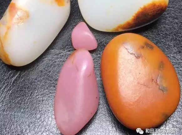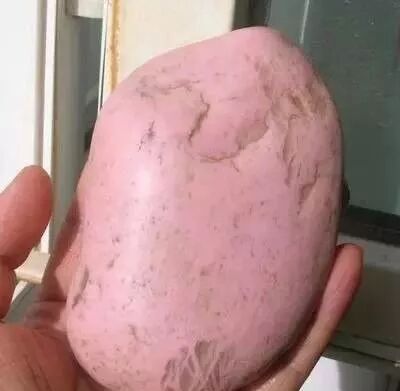上图都为直闪石玉。阳光下这些玉石的颜色较淡,而灯光下则颜色会变深很多,呈粉红色或粉紫色。肉内会看到少许的墨点,黑点较小,较少。产地目前只发现于墨玉河,也就是喀什河。只有籽料,目前还没发现山料。如今市场上很多乱七八糟的玉石被称为桃花玉,而这种“玉”之所以在市场上存在一是因为它的颜色,另外就是利用和田玉的概念。不过,如果只是抱着当作简单饰品的话还是可以,这种东西都不贵,觉得挺稀罕,可以买一两块玩玩。