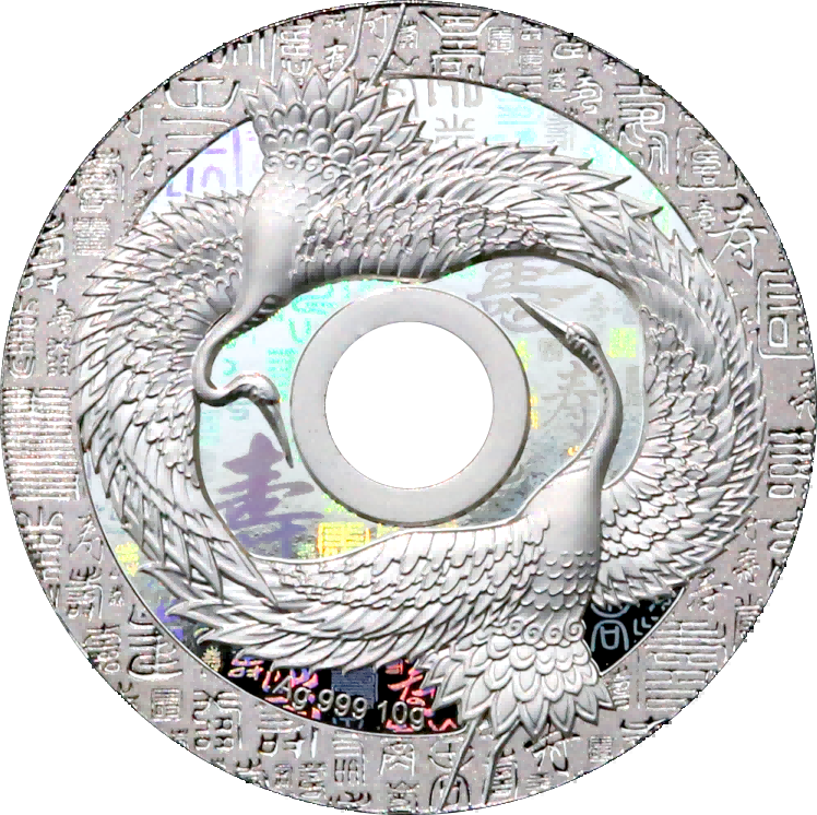 币上为两只展翅的白鹤。白鹤有鸟类“活化石”之称,且还是长寿鸟,所以在我国民间,将白鹤视为是吉祥长寿、品德高尚的意象。