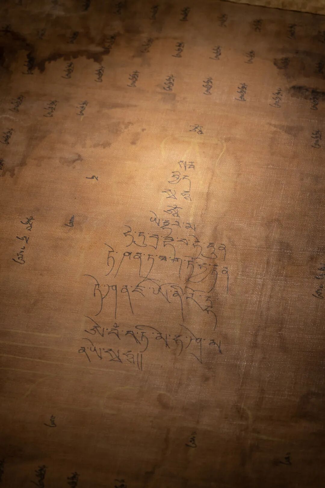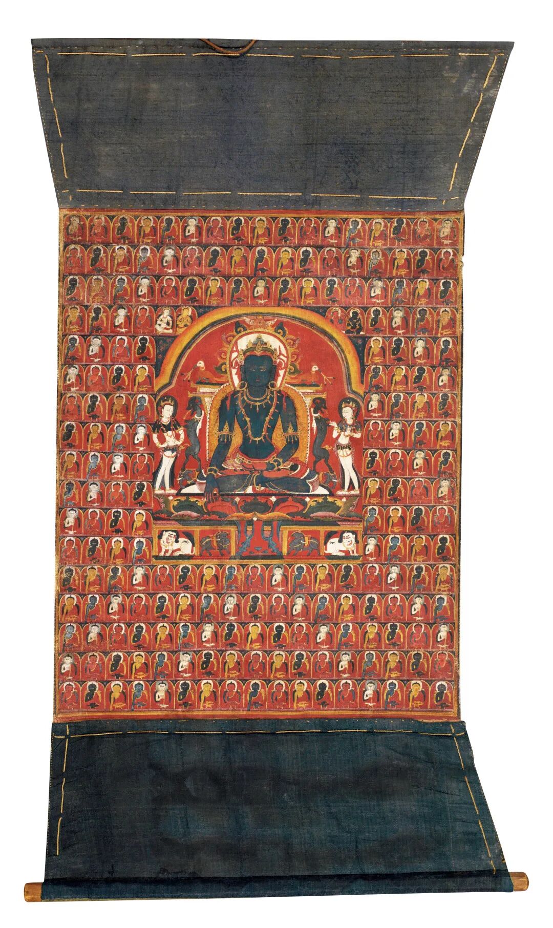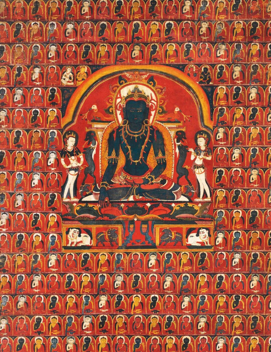 阿閦佛,是東方妙喜世界的教主。為金剛界五智如來中的東方如來,金刚乘佛教中代表大圆镜智的主要佛陀,居住在曼陀罗的东方。就此幅唐卡的艺术风格而言,展现出浓郁的13世纪前后西藏中部地区唐卡绘画的艺术风韵。唐卡设色以蓝、红为主。平涂技法上色,色彩之间区分明显,画面沉稳大气、庄重肃穆,与晚期唐卡鲜艳明亮的色彩形成鲜明的差别。布局方式采用了棋格式的平面化构图,将两百多尊佛尊整齐排布于方格之中,此种人物排布形式源自于古印度绘画,在印度阿旃陀石窟上就有所见,敦煌出土的吐蕃时期帛画、11世纪扎塘寺壁画等这些彰显出古印度艺术风韵的绘画作品中也能看到,明显受到印度佛教绘画艺术的影响。双层三角形三叶冠饰、人物身上的配饰样式乃至供养菩萨的盘坐姿态都能在东北印度帕拉风格艺术作品上找到其艺术原型,是古印度造像艺术对人体结构的精准解析和完美呈现,展现出鲜明的帕拉艺术风韵。但人物五官的描绘中又能看到来自尼泊尔艺术的影响:主尊与胁侍菩萨皆脸型圆润,五官集中,嘴唇小巧精致,身躯壮硕而挺拔,四肢粗壮而有力,与13世纪前后萨迦寺、夏鲁寺收藏的尼藏风格造像一致,但主尊背光头顶带角的迦楼罗鸟明显是西藏本土风格。这种在一幅作品上能看到不同时期不同地域艺术风格的影响的艺术风格,体现了画师们对中和印度和尼泊尔影响而形成的西藏艺术风格的理解,亦充分体现了此时期西藏绘画吸收、借鉴与融合的多元、包容的艺术特性。唐卡背面主尊位置以塔型布局用藏文书写有不动如来咒语,周围布局的每尊佛背面皆有种子字”嗡阿吽”,代表一切诸佛的身语意转化功能的加持。因为唐卡为天然的矿物颜料绘制,对空气的温度,湿度、保存环境都有很高的要求。由于藏地气候的干燥,供养人经年的供养、卷张等,唐卡表面的颜料极易起壳脱落,再加上年代久远,因各种历史战乱及画主更替、迁徙等等原因,在市场上15世纪以前的唐卡极为少见,画工精细,品相保存良好的更是弥足珍贵。故一般来说,市场上若有画工及品相皆不错的早期唐卡出现,都能引起爱家的关注以及不错的市场成交表现。此件13世纪东方不动如来唐卡,画工精妙,宗教神格鲜明,艺术源流清晰,为研究早期唐卡的艺术传承提供了可靠的依据,具历史研究、宗教研究与艺术研究于一体,殊胜难得。