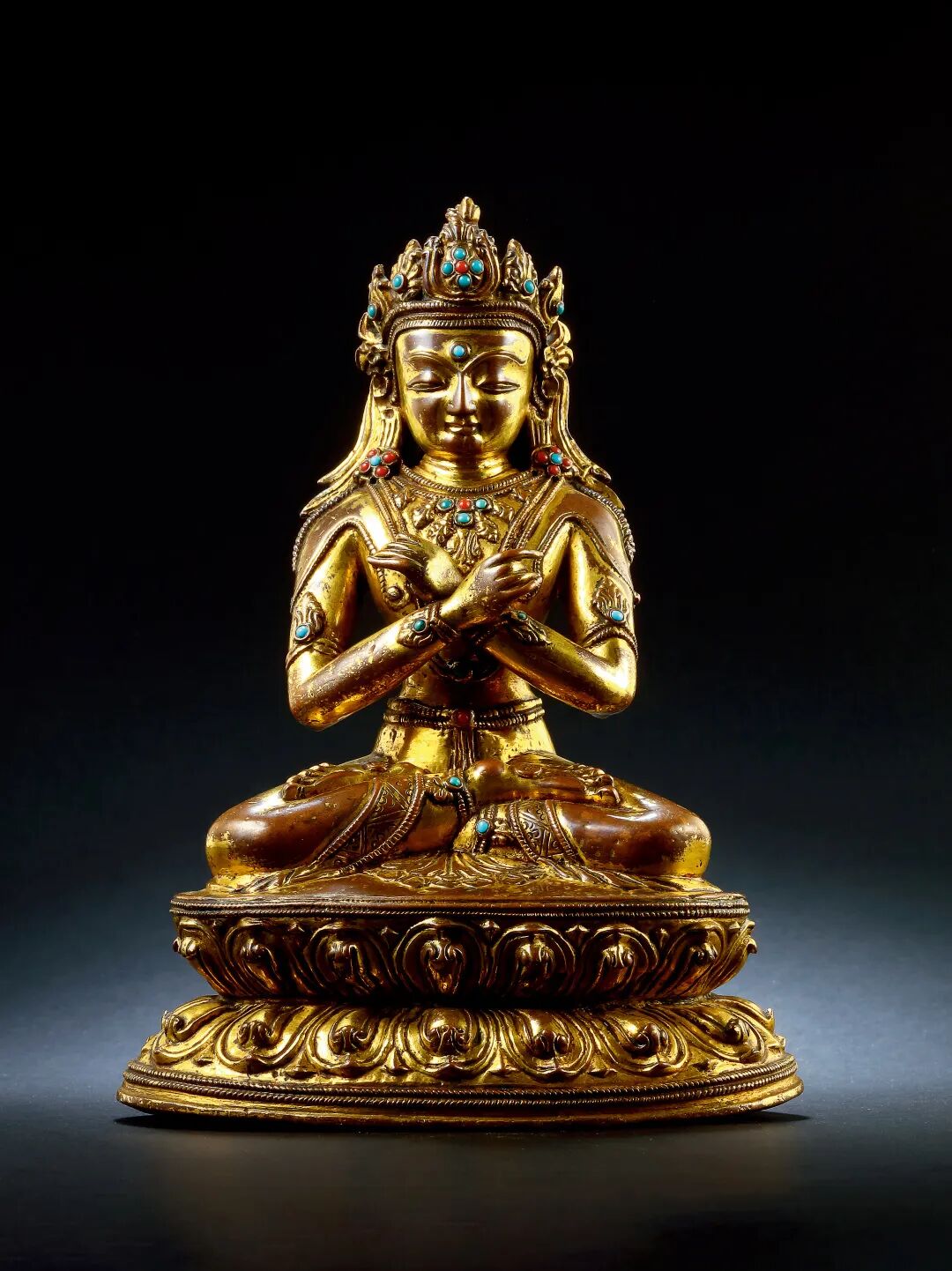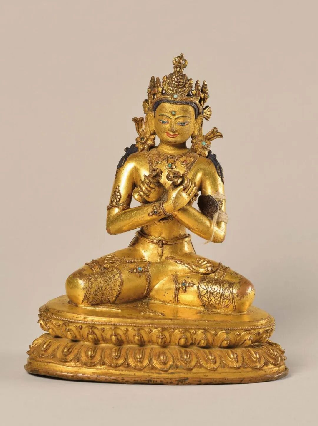 此尊金刚总持绚丽夺目,头戴镶嵌诸多宝石的花叶宝冠,头顶束高发髻,或散于脑后,或披于肩头两侧,尤其后脑的头发有束发辫,可以看到明显的穿插关系,仅凭这个一个小小的细节就能看出此尊造像做工极为细致!耳挂圆珰,还有臂钏、手镯、璎珞为周身庄严,其上并嵌宝石,衬托下的造像奢华精美!整像英朗舒适,面相宽平,眉如弯月,双目俯视,眉间白毫嵌松石,面相端庄,表情肃穆,具足威仪之态!腰身挺拔,身体极为壮硕,其双手于胸前施金刚吽迦罗印;下身着长裙,双腿结全跏趺坐于莲台之上;裙摆边缘明显刻有花纹,十分精致华美,具足高贵之气!!其下莲座造型低矮稳固,双层的束腰复瓣莲瓣圆润饱满,上下对称规整排列环绕莲台,其实,光是看莲瓣的整齐度就可以断定佛像的级别!同时在上下边缘还饰有不同尺寸的连珠纹,美观大方!底部保留装藏,十分殊胜!整件造像形制大气,周身的装饰尤为精美奢华,璎珞、钏镯上镶嵌的宝石,更是神来之笔,衬托下的金刚总持神韵生动,气势雄浑,生动表现了金刚总持这一罕见形象的超凡气质!躯体壮硕,肌肉劲健有力,体态优美舒展,造型大气完美,充分表现了金刚总持在藏传佛教中的至尊地位和悲智双圆的宗教特质,具有震撼人心的强大视觉冲击力量。为此类题材精品中的精品!!非常具有收藏价值!!金刚总持是印度梵语意译名称,音译“伐折罗陀罗”,藏语称“多吉羌”。关于其身份和地位有多种不同的说法:一种认为他是本初佛,即最原始的佛陀;一种认为他是报身佛;一种认为他是法、报、化三身的总集;一种认为他总摄了五方佛的智慧与功德,称他为“第六金刚持”或“金刚总持”他都是藏传佛教崇奉的“最高”尊神!在藏传佛教各教派中,噶举派对金刚总持尤为崇奉,噶举派尊金刚持为本初佛,在表现噶举派题材的唐卡和其他绘画形式中,金刚总持往往被置于上方中央,而受到特殊的礼敬;同时噶举派还将金刚持奉为本派的鼻祖,认为噶举派全部教法皆源于金刚总持,金刚持后帝洛巴、那诺巴、玛尔巴、米拉日巴、冈波巴次第相传,最终成就了西藏噶举派的庞大体系!所以供奉金刚持本尊咒可聚集一切诸佛之功德,能消除罪业,成就一切种智,并得历代传承祖师的加持。