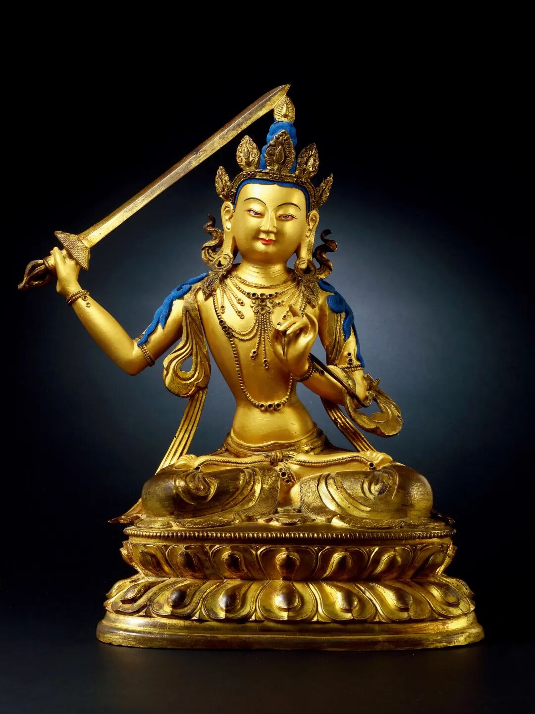 清代宫廷造像做工精细,风格成熟,为汉藏融合式风尚的成熟期。康熙、雍正及乾隆三朝宫廷造像则将蒙古、汉地的造像精粹相融合,并于此之上,以藏传佛教的风格和铸造工艺,创造性地发展出更加华美而具雄阔气度之佛像风格。此尊文殊菩萨像,具有北京宫廷造像的明显特点,无论从造型或工艺水准方面,均显示出极高的品质。造像面相圆润丰满如童子般充满朝气,弯眉目微瞌,相容静谧,发髻高束,头戴五叶宝冠,身体微微右倾呈小幅扭姿而坐,身体线条灵动,上身袒露,周身佩戴璎珞钏环等配饰。右手高擎智慧宝剑,表示菩萨的智慧如利刃般能斩断一切烦恼与愚痴。下身着长裙,衣缘錾刻缠枝花卉纹,衣纹线条自然写实,不似萨尔纳特风格般轻薄透明,亦不似汉地造像般厚重繁复,这亦是汉藏风格佛造像在衣纹表现方面的一大特点。全跏趺坐于双层束腰仰覆莲花宝座上,上缘饰连珠纹一道,深束腰,莲瓣里外三层,立体感极强,与典型的清中期造像采用的莲座制式相符。整件作品体量较大,比例结构精准,与造像量度经中所列明尺度极为相似,纤细又不失健美的身形,显示其受到比较强烈的西藏造像风格的影响,在汉传菩萨造像的祥和儒雅、柔美端庄中,注入了一种强健英武之气,为清代宫廷造像中难得一见的范例,极为难得。文殊菩萨指代的是智慧,经书有云:“摄心为戒,由戒生定,由定生慧。”由此可见,文殊菩萨是以静行法门当作摄心的法门。在静行法门里指出,我们事事都要多为其他人着想,也就是说我们要有着无私的信念,将大众的利益排在第一位。只有那些心无私利之人,才能入三昧之境,得大智慧。也就是说,供奉文殊菩萨能够让我们提升智慧,不在纠结于那些烦恼是非,心如明镜。