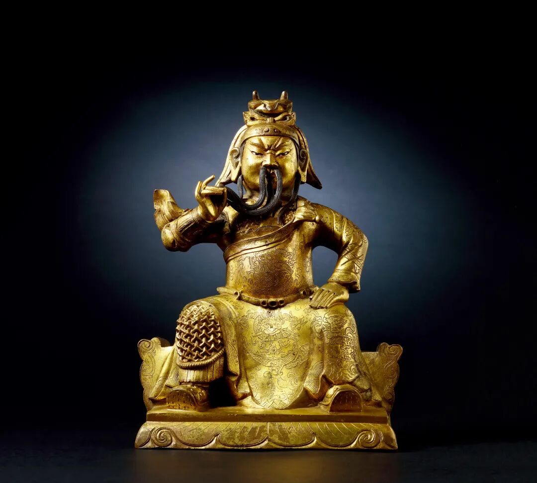 关公的刚正不阿,忠诚守信的优秀品质深入人心。在中国民间是忠义的化身,也是佛教与道教共同尊奉的神祗,深受历代民众之爱戴。道教尊之为“关圣帝君”,奉为守护城关的神,也有称为文财神,汉传佛教奉之为“伽蓝菩萨”,而藏传佛教的高僧如三世章嘉若必多吉和土观呼图克图认为关公是密宗的护法神,称他与大红司命主是同一心识,还考证关羽是护法神多杰东都或赤尊赞的化身。此尊关公坐像为乾隆宫廷精品之作。关公并未拿刀,为文关公像,是主事业,智慧和学业。关公像通体镀金,金面璀璨,雕工精细,造型气势磅礴。关公头戴武生双绦软巾,,眉眼上翘,呈倒八字形,双目直视前方。长须美髯,五绺长髯飘洒于胸前,威风凛凛。右手捋须,左手置大腿上。身着铠甲蟒袍,内着甲胄,胸前蟒袍錾刻精美的龙纹,双腿张开呈端身正坐之势,右膝铠甲露出。衣纹细腻流畅,技法精湛娴熟,细部雕刻纹饰一丝不苟,铠甲鳞片立体突出,战袍上的团龙纹、袍缘云纹等细节均錾刻工整精致,更衬托关公形象威武。