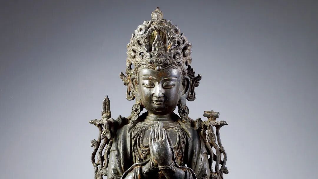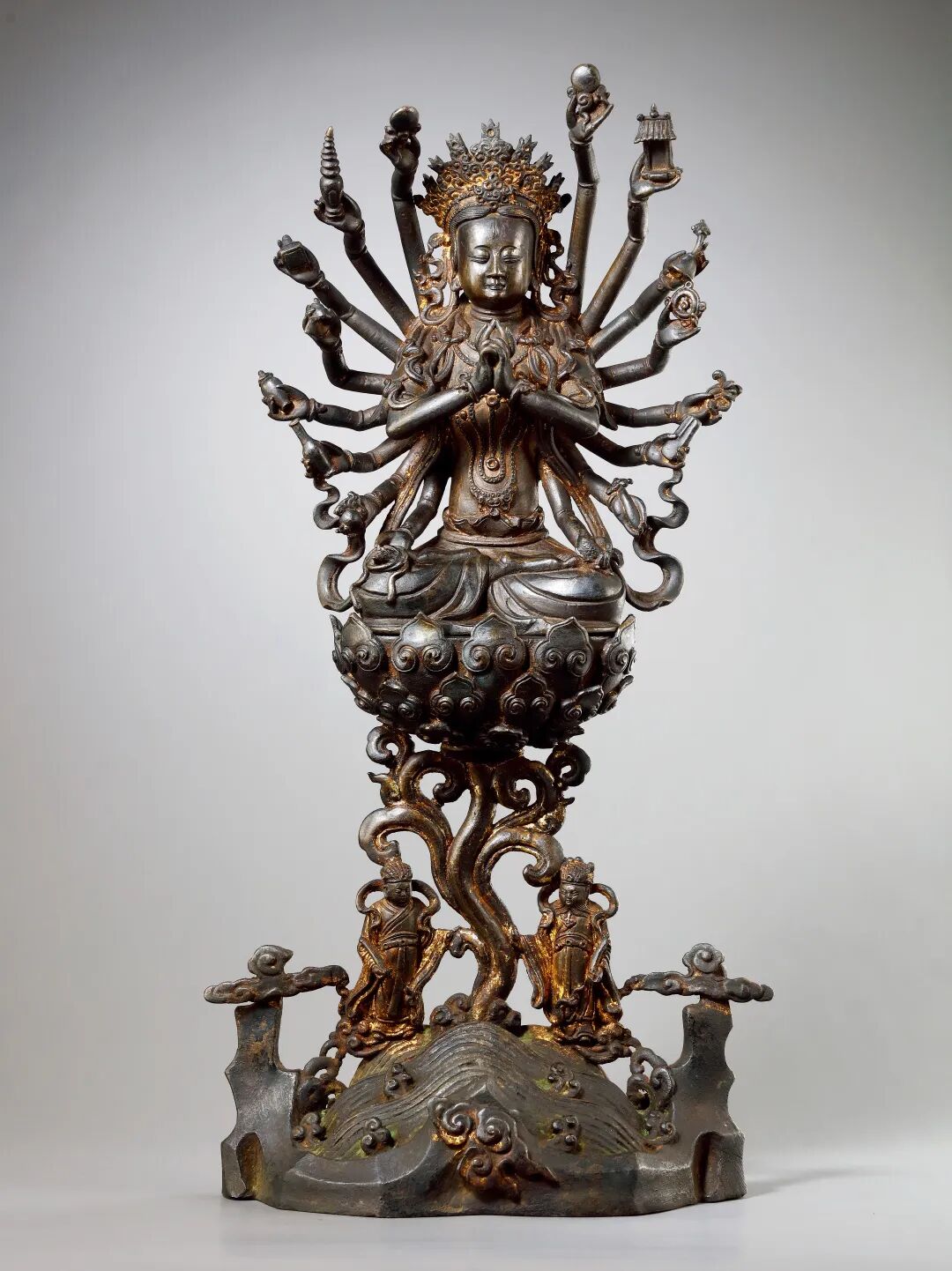 准提观音(梵名Dorje Tsundi)也作准胝观音、七俱胝佛母准提或作人天丈夫观音等。密教六观音之一。准提意为沽净,指此观音心情清静的意思。又俱胝梵文意为“千万”,七俱胝即“七千万”,但这里指数量众多之意,密教认为此菩萨是过去无量诸佛之母,故称为“七俱胝佛母”。据说此观音常来世间,摧毁一切众生之惑业,能使众生消灾延寿,并能使众生消灭罪障。因准提观音具有如此广大功德。带有密教色彩的准提行法流行于元明清三朝,传持准提科忏法,遍及僧道儒士、王公庶民,以及禅宗、天台、华严、浄土诸派。其原因一,准提法总摄五部,独部别行,龙树集成,意义重大,且易修持。其二,时人以为准提行法更适合于在家俗居士行持。其三,此法依据准提佛母有慈母救赤子之意,所以皈依准提佛母,可得慈母之救度。因而准提佛母造像作为明代宗教美术类作品,以成经典。此尊造像与不空译《七俱胝佛母所说准提陀罗尼经》中经典的准提佛母形像完全一致,佛母头戴毗楞伽摩尼妙宝,以为天冠,束发高髻,发分多股垂于肩上,耳际宝缯飞扬。圆脸丰颐,眉细如弯月,面生三目,其三目分别代表佛眼、法眼、慧眼,鼻梁高挺,嘴角上扬微露笑容,展露佛教无边的慈悲胸怀,和对众生无私的怜悯。胸前饰项圈璎珞,上身双肩搭帔帛,帔帛在两手腕间分别绕成半圆环,垂搭腿部两侧。下身着天衣长裙,腰间束带,线条清晰流畅,做工规整,艺术感强。胸前的二手作说法相,表示为破贪慎痴三障,余臂手中持有莲花、利剑、绢索法器等,因“若求十八不共法者。应观十八臂,即如画像法观也”之仪规:主臂双手结准提观音根本身契,“先以二手小指二无名指,相叉入掌,二中指直竖头相着,二头指头附二中指上节侧,二大指各附二头指侧,即成”,其余诸臂分别为“右第二手施无畏,第三手把剑,第四手把数珠,第五手把微若布罗迦果,第六手把越斧,第七手把钩,第八手把跋折罗,第九手把宝鬘,左第二手把如意宝幢,第三手把莲花,第四手把澡罐,第五手把索,第六手把轮,第七手把螺,第八手把贤瓶,第九手把般若波罗蜜经夹”,此尊造像持物更复,且十八法宝皆具,颇为难得,艺术感极为强烈。结跏趺端坐于三层的仰莲莲座之上,莲瓣错落相间,层层分明。座底作一圈镂空卷草纹,下有七宝莲池,扶持莲茎的两位人物参阅中国台湾故宫博物院藏明代准提佛母佛画,应为难陀和拔难陀两尊龙王像。整个莲台就表现了佛教所说的“三千大千世界”,体现世尊宽大慈悲之怀,象征准提佛母品格的圣洁和超凡脱俗的崇高地位。整尊造像精铜铸造,皮壳古朴,品相完美。造像神态庄严肃目,造型比例匀称,结构严谨合理,尺寸如此高大,保存如此完整,实属罕见,应为汉地皇家寺院或大型寺庙所供奉。