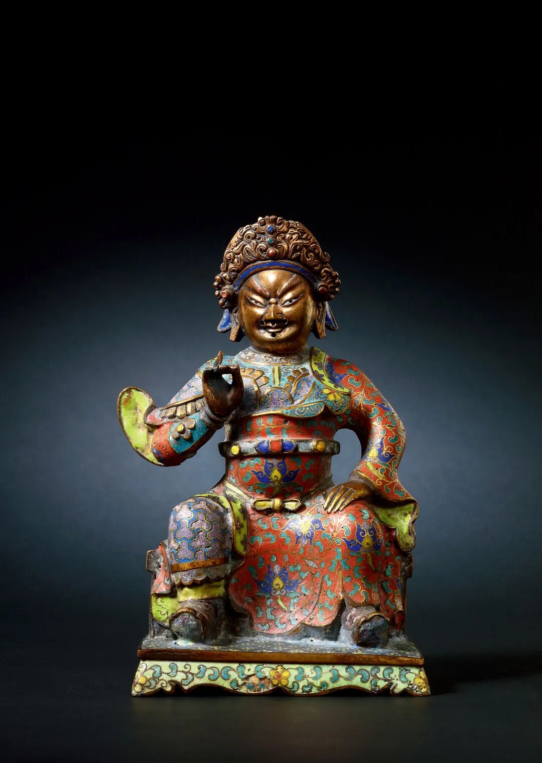 关公即三国时蜀汉大将关羽,其在佛教中是伽蓝菩萨,即寺院的守护神;道教尊之为关圣帝君,并赋予司财的职能;而民间视其为忠义的化身。这种三教合一式的神格,在宗教造像上是绝无仅有的。此尊关公像头戴宝冠,面庞方阔,浓眉交蹙,凤目微合。身穿甲胄,足蹬云靴。右手捋美髯,左手抚胯部,端坐在方台之上。此尊关公以精美的铜胎掐丝珐琅工艺打造,具有乾隆时期内地造像的显著特征。