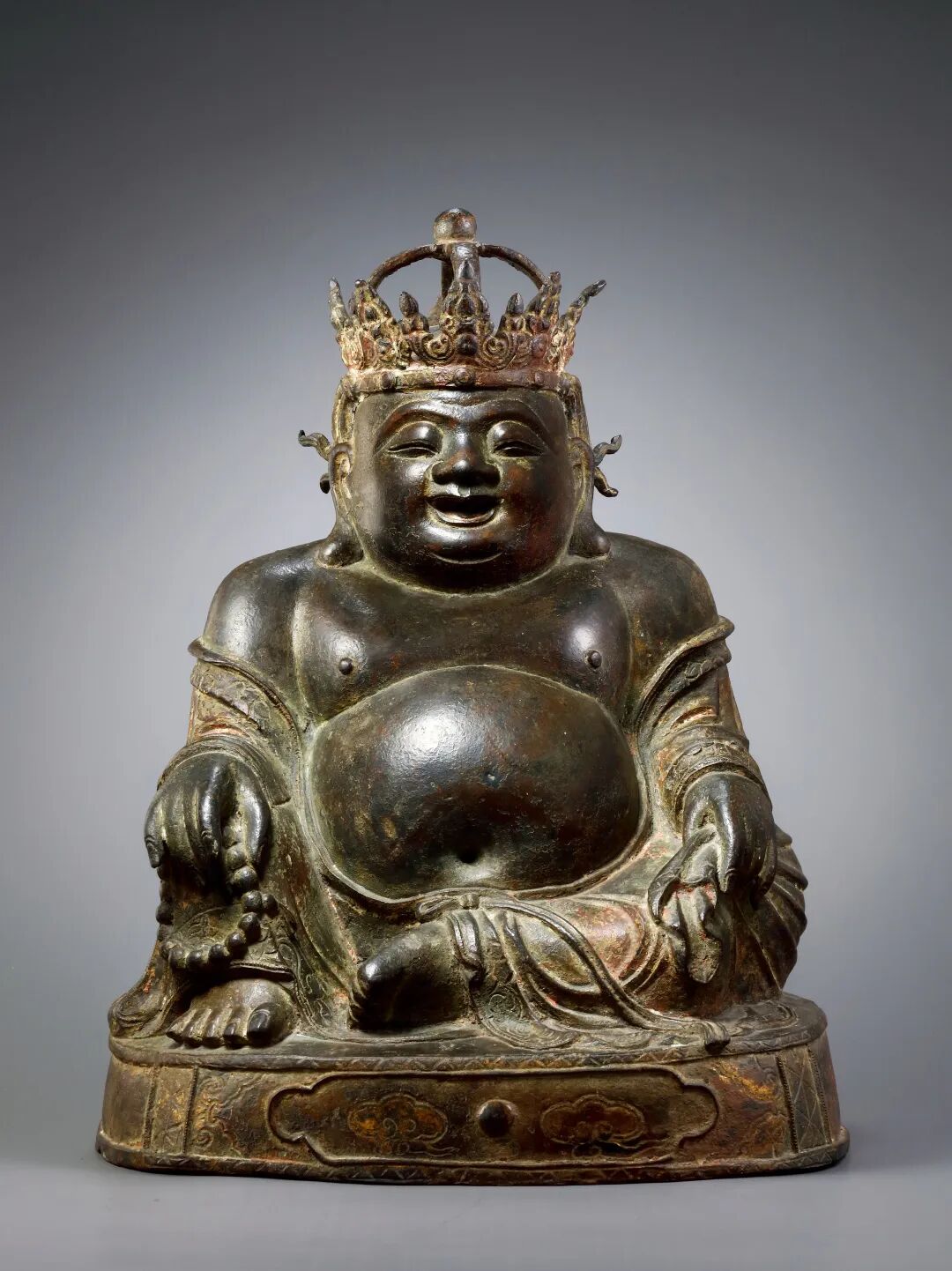 此弥勒佛像,尺寸较大,气势磅礴,箕踞而座,头戴宝冠,两耳垂肩,喜眉乐目,笑口大开。其衣袍宽松,坦胸露腹腹部浑圆,右手掐串珠,左手提一布袋,乃明代中期典型造像。弥勒佛,亦称未来佛。历史上有一名叫契此的游方僧人,又号「长汀子布袋师」。据《宋高僧传》卷二十一、《佛祖历代通载》卷二十五载,他是浙江奉化人,容貌古怪,长得矮胖,肚子奇大,常用竹杆挑着一个大布袋,面带笑容,四处化缘,他见物即乞,语无伦次,随地寝卧,如颠似痴。此后,中原的弥勒佛形象多以此人的形象而制。弥勒菩萨又称作弥勒佛、欢喜佛、笑佛等。正所谓「大肚能容,容天下难容之事;开口便笑,笑天下可笑之人」,弥勒佛于汉文化中尤为流行,代表着中华民族的宽容和智慧。佛联中的字句令人回味悠长,蕴含着人生哲理,启迪思想。世间万物芸芸众生,人间情仇悲欢离合,荣华富贵贫穷贵贱,地位官阶灯红酒绿,都付之一笑。相传弥勒菩萨常以不同化身对穷人布施散财,所到之处,欢乐钱财跟着来,视同财神,据说摸一下他的大肚皮,还能消灾除病,保佑平安。