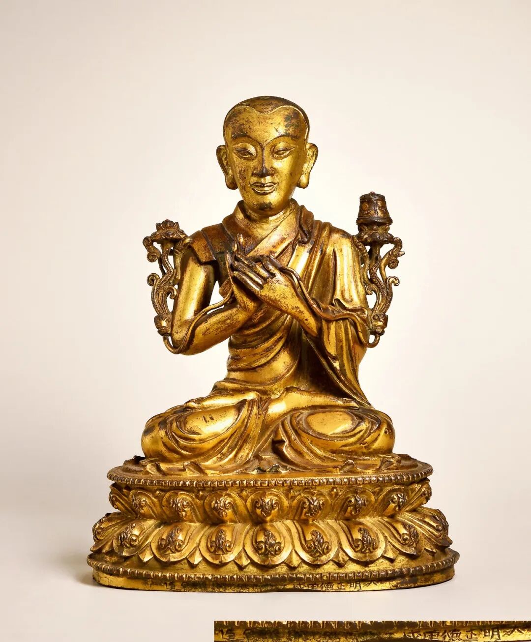 萨迦派是藏传佛教的重要宗派之一。主寺萨迦寺位于西藏日喀则地区萨迦县境内,寺院分南北二寺,仲曲河横贯其间,南寺位于南岸的平坝上,北寺坐落在北岸的本波山“灰白土”山岩下。“萨迦”是藏语地名,意为灰土,因建寺地点的地理特征呈灰白色而取地名。寺院围墙上涂有象征文殊、观音和金刚手“三怙主”菩萨的红、白、蓝三色条。又俗称“花教”。该派创立于11世纪,创始人昆·官却杰波。其后,教主皆由昆氏家族世代相传。萨迦班智达为第四代教主,俗称萨迦四祖。萨迦班智达,藏名贡噶坚赞,是西藏地方家喻户晓的人物。班智达的称号来源于印度,意思是学识渊博的大学者。萨班是西藏佛教史上第一位被誉为班智达者。据《萨迦世袭史》记载,萨迦班智达于1182年生于昆氏家族,从小即能说印度梵语。由于天资聪颖,加上师长的培养,自己的努力及家族的熏陶等等,萨班在成年的时候就已经精通了大小五明,成为著名的学者。在佛学方面,他除了精通萨迦各种教法之外,对於其他教派如噶当派、希结派的教法,也相当通达。在声明、韵律、医药、戏剧、无上瑜伽密续方面皆有多部著作,因此被称为雪域三大文殊化身之一。此尊萨班面呈比丘相,脸庞清瘦,额际宽广,鼻梁挺直,双目炯炯,面容和善,生动塑造出其作为宗派领袖的坚毅性格。双手置于胸前结说法印,各捻一束莲花开于左右肩,莲花上端镶嵌红珊瑚,做工精细,充分体现出其作为文殊化身班智达的神阶。坐姿挺拔,形象生动写实,上身内着僧祗支,外披袈裟,衣纹刻划自然写实,完全秉承永宣宫廷造像一贯风格。小腿部椭圆形衣褶,是明代佛像中常见的装饰手法。仰覆式莲花座,上下缘饰精细连珠纹,莲瓣宽大有力,端头饰卷云纹,具有明显的永宣时期造像遗风。造像整体铸造精美,形象生动传神,金色亮丽,时代特征明显,底座正面下缘刻有“大明正德……造”款识,准确指出这尊佛像制作于大明正德年间。在明代历史上正德皇帝是一位充满矛盾和率性的皇帝,他好杀好色,又笃信佛教;精力充沛,才思敏捷,又放纵不羁。明史中记载他沉溺藏传佛教法事的记载最多,他与藏僧频繁往来,精通佛教经典和梵语,能口诵梵经,修习密法。史载其“佛经、梵语无不通晓”。更曾大兴土木建造寺院,甚至自称为“大庆法王西觉道圆明自在大定丰盛佛”,命礼部为之铸造金印,兼给浩命,并以皇帝和大庆法王的双重名义签署诏浩救令。政治上,沿袭了明朝历代皇帝对西藏的笼络政策,即对西藏上层僧侣广行封赏。在大规模封赏活动中,朝廷不仅赐予封号和官职,而且赏赐大量的珍贵礼物。在赏赐的礼物中,佛教造像便是十分重要的一部分。整尊造像法相写实,工艺精致,工匠传神的将上师独具魅力的个性化表现得生动自然。衣纹及莲台的工艺与永宣时期一脉相承,时代与地域特征明显,再加上有明确的正德题记,佐证了造像的出处与年代,弥足珍贵,为研究明代宫廷佛教艺术提供了可靠的例证,也为我们了解当时社会的历史及审美情趣提供了真实可触的实物依据,殊胜难得。