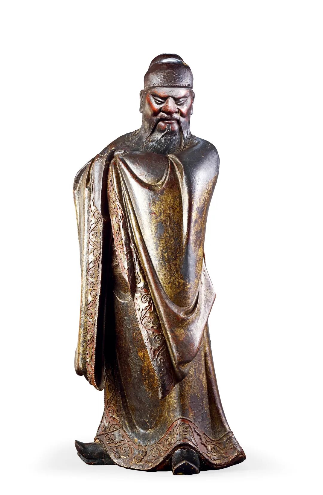 关公在汉传佛教中被奉为伽蓝菩萨,即寺院和守护城关的神。藏传佛教则认为他是密宗护法赤东赞的化身,道教尊之为关圣帝君,并赋予司财的职能。这种受到不同宗教崇拜的古代人物颇为少见。关公的封诰历朝不同,但有两个统一的评价,贯彻始终,那就是“勇”和“义”, 这也是关公像广受崇祀的原因之一。关羽的刚正不阿,忠诚守信的优秀品质深入人心,受到历代皇朝与民间的爱戴和尊奉,其造像制作不衰。此尊关公立像身着绣边长袍,头带锦帽,面庞丰满,蚕眉紧蹙,凤眼微睁,目光下敛,表情威严,气质刚毅。左右手交握于胸前,极为少见。衣袍表面镀金、红黑漆上高浮雕装饰有波泽纹和漆雕纹饰,判断应为典型的福建工造像。明清时期的木雕以福建最为卓越,其高度的造型能力及精妙细腻的粉线描绘工艺将人物神态表现尽致,此像的身量高大,体态丰腴,仪态威猛,铸造工艺精美,细部雕刻一丝不苟,衣纹流畅。整体人物造型富有立体感和写实性,应是明代艺匠高手所为,具有强烈的艺术感染力,是明代木雕塑艺术的精品之作。