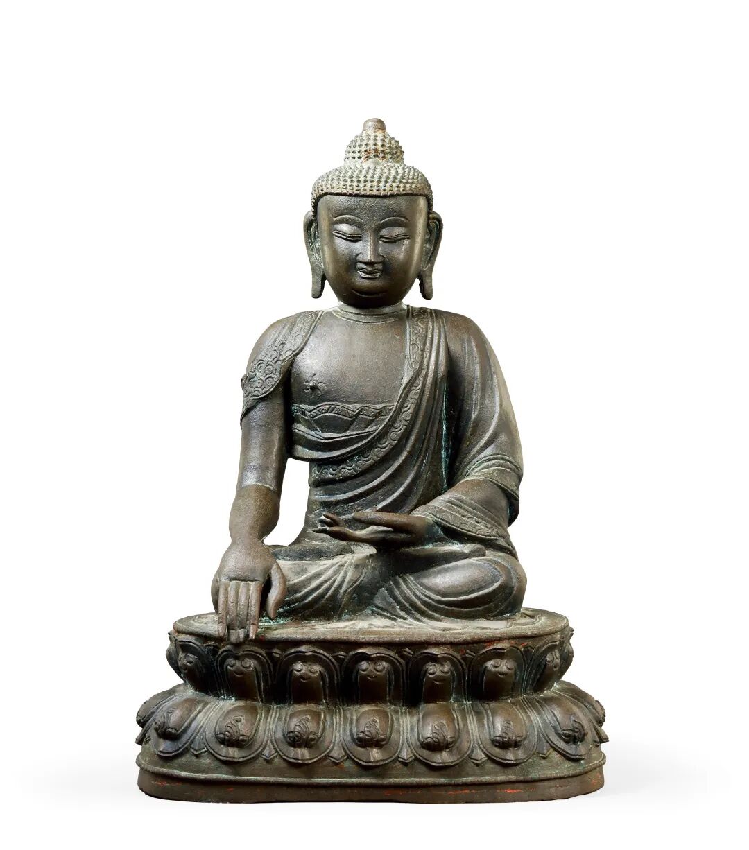 此尊释迦牟尼佛成道像,发髻高耸,上顶宝珠,面相方正圆润,双目微睁,嘴角微微上扬,大耳垂肩,五官刻画清晰,棱角分明,温和端详。佛像身披佛衣,衣纹层迭有致,线条流畅自然,衣缘錾刻细密的花纹,细密繁复。右胸及右臂袒露,左手于腹前结禅定印,右手置右膝结触地印。双腿结跏趺坐。莲花底座莲瓣细长插拔,瓣尖饰卷草纹,时代特征鲜明。造像以释迦牟尼佛成道为主题,成佛后的释迦牟尼,尊称为佛陀,意思是彻悟宇宙、人生真相者,民间信仰信徒也常称呼佛祖。本件造像虽久经沧桑,但神彩不减,仍为同时代精品。