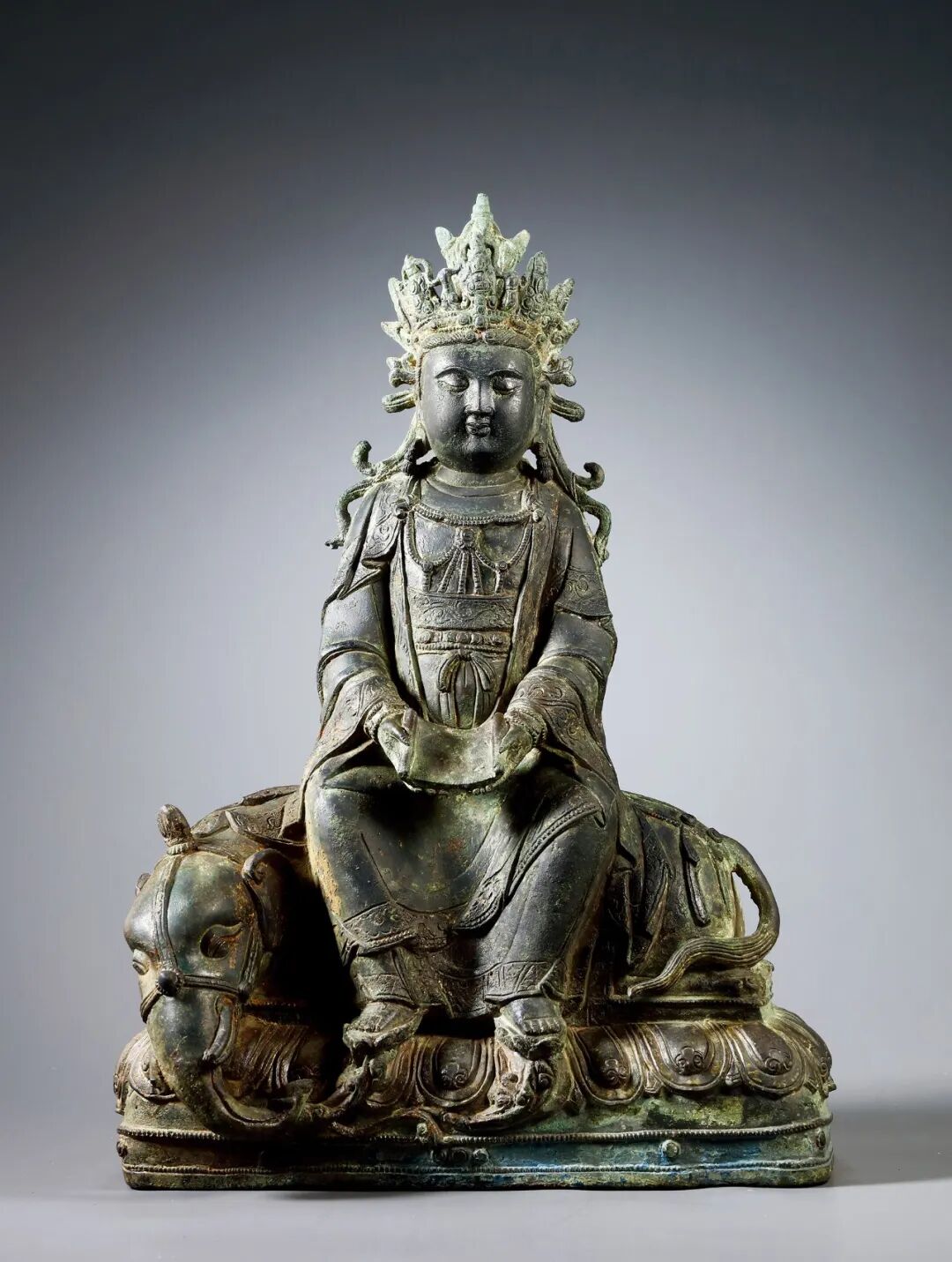 此尊持经普贤菩萨像,头戴五叶宝冠,面宽额丰颐,眉似弯月,双目垂俯,相容宁谧肃穆,显得睿智而慈和。身躯挺拔,双手于脐前持经卷,端稳持重。《法华经》中记载,《法华经》的持经者为普贤菩萨,与陀罗尼品中同样守护信徒的十罗刹女和鬼子母神、以及其随侍药王及勇施二菩萨、持国与多闻二天组成一群,驾祥云现身于修行者面前。此尊造像身着菩萨璎珞装,胸前璎珞繁复,衣缘满刻缠枝花卉纹,左腿垂放,右腿微内曲,舒坐于象背之上。其坐骑为“六牙白象”,象征菩萨修行的“六度”,大象长鼻卷曲,身躯强壮,背披锦毯,神圣高洁,彰显普贤菩萨的沉稳祥和。此像铜质精炼,造型端庄,做工精细,尤其在普贤菩萨面部神态的塑造上表现得极为精妙,整体给人庄严神圣而又慈祥亲切的宗教美感,反映出匠师极高的艺术水准,品相完好,是一尊极为难得的明代早期汉地造像精品。