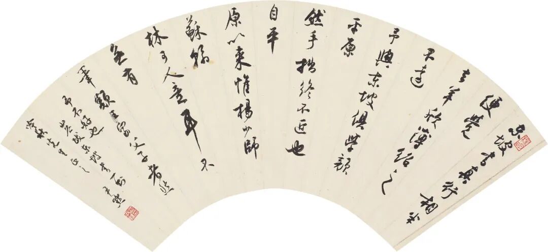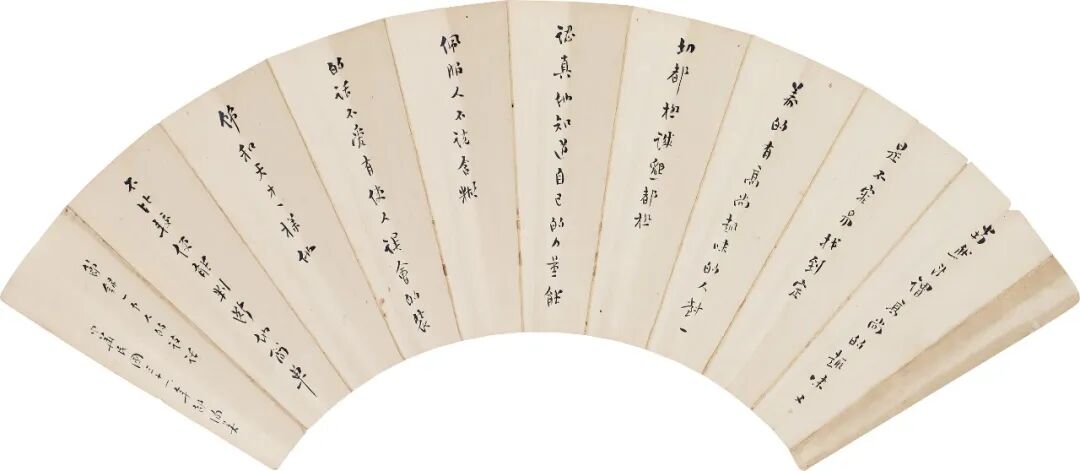 1934年的《人言周刊》从第一卷第12期起特辟一个专栏。题名为“一个人的谈话”,由时任编辑的邵洵美担任专栏主笔谈文论艺。乐此不疲,一直连载到第27期方告终。此扇面是民国三十一年,邵洵美节录“一个人的谈话”专栏,当时连载的十五期文章其中一段。邵洵美传世书法作品极少,此作是女儿邵阳家中留存的唯一一件,弥足珍贵。