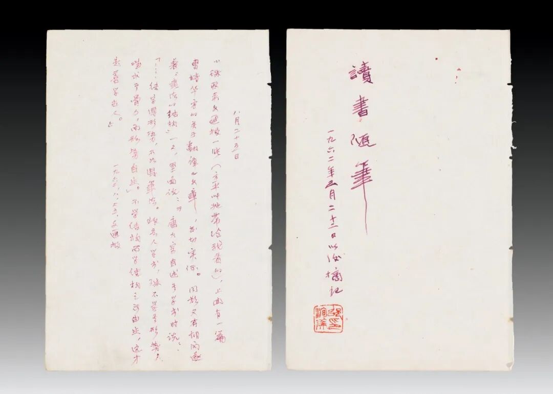 1955年4月1日邵洵美开始写“案头随笔”,随时记录有关翻译的心得,到1956年11月5日共计16则,全部用红水墨水写的。相隔6年后,又开始在此小册子空页上写“读书随笔”并注明“1962年2月22日以后摘记”,下面盖有邵洵美印。但仅在8月25日写了七行字,便结束了。所以此则“读书随笔”是邵洵美留存唯一一则而已。
