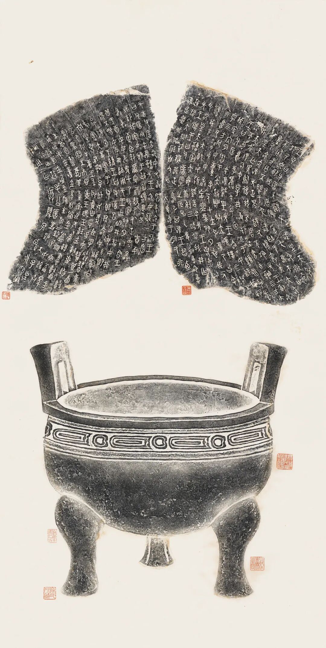 此本为全型拓本,铭文为左右两纸分拓,浓墨棰拓、字口清晰、原装旧裱,为民国王秀仁所拓。王秀仁,杭州人,是民国间金石器物与印谱钤拓第一人,他与吴湖帆交谊深厚。《吴湖帆文稿·丑簃日记》载王秀仁曾登门为吴湖帆传拓各类家藏的玉石印款等。鉴赏家陈咏仁为民国巨贾,民国间出资赎出毛公鼎。