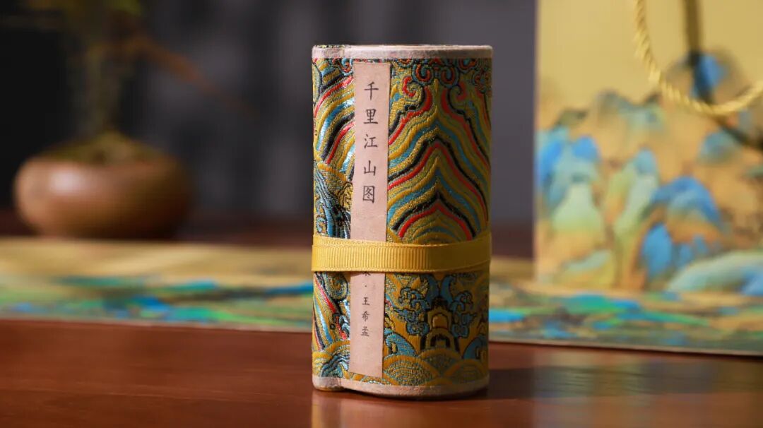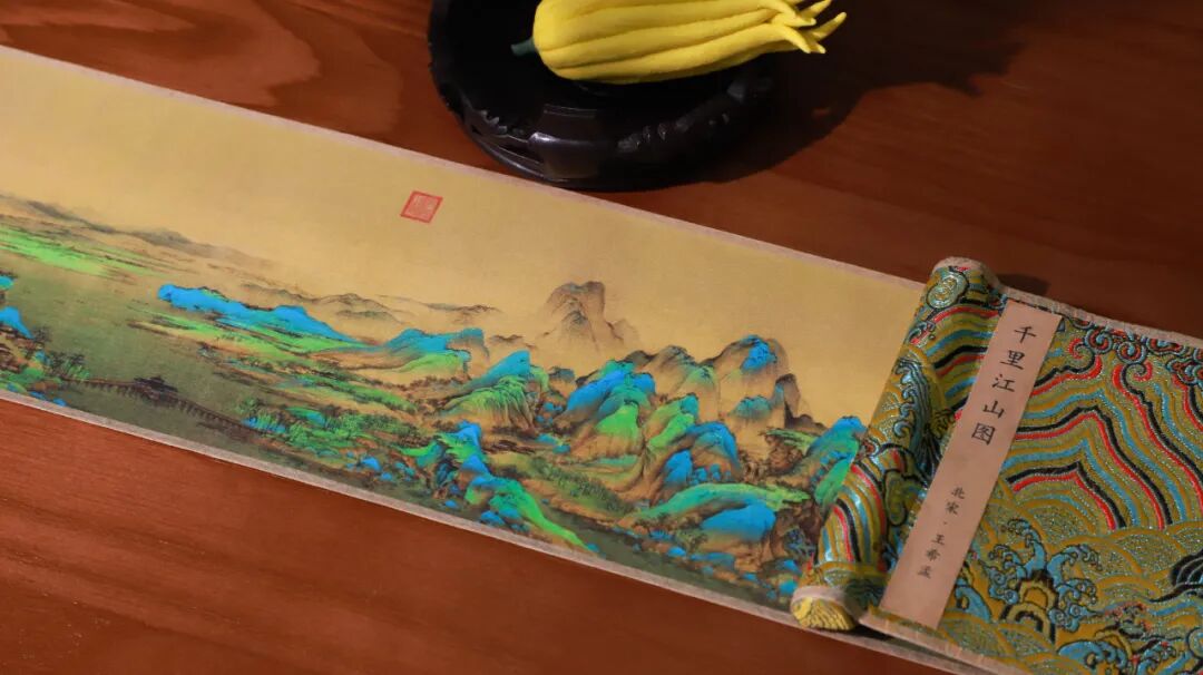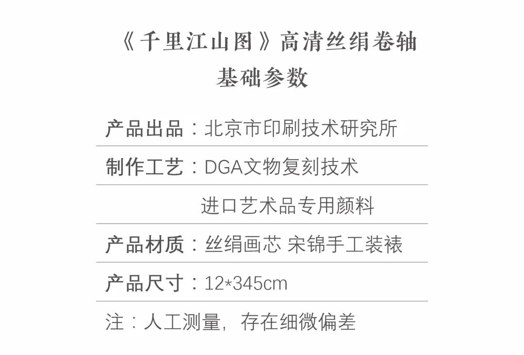 高清丝绢《千里江山图》卷轴,按照原画尺寸等比例微缩,卷起仅有手掌大小,同时使用文物DGA复刻技术,保证全卷高清。
