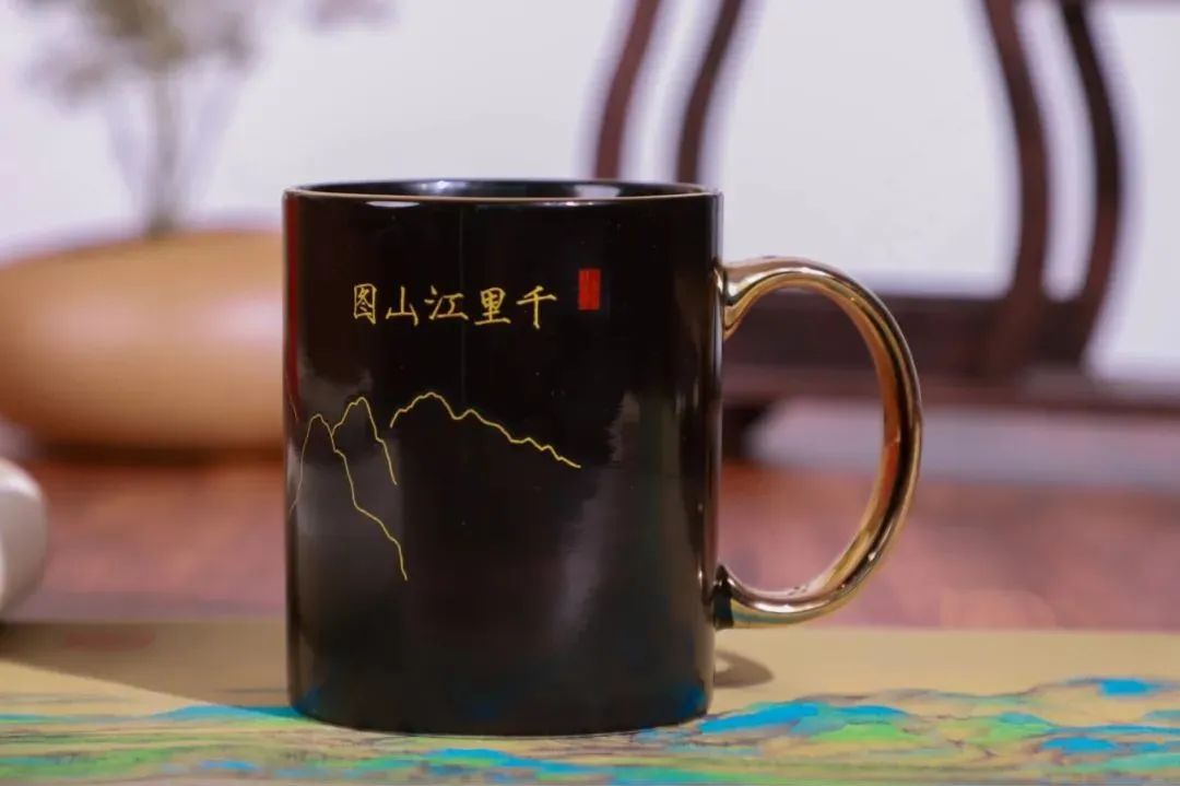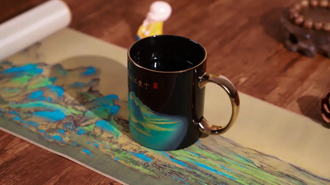《千里江山图》感温变色杯制作精美,是对《千里江山图》的又一次全新诠释。