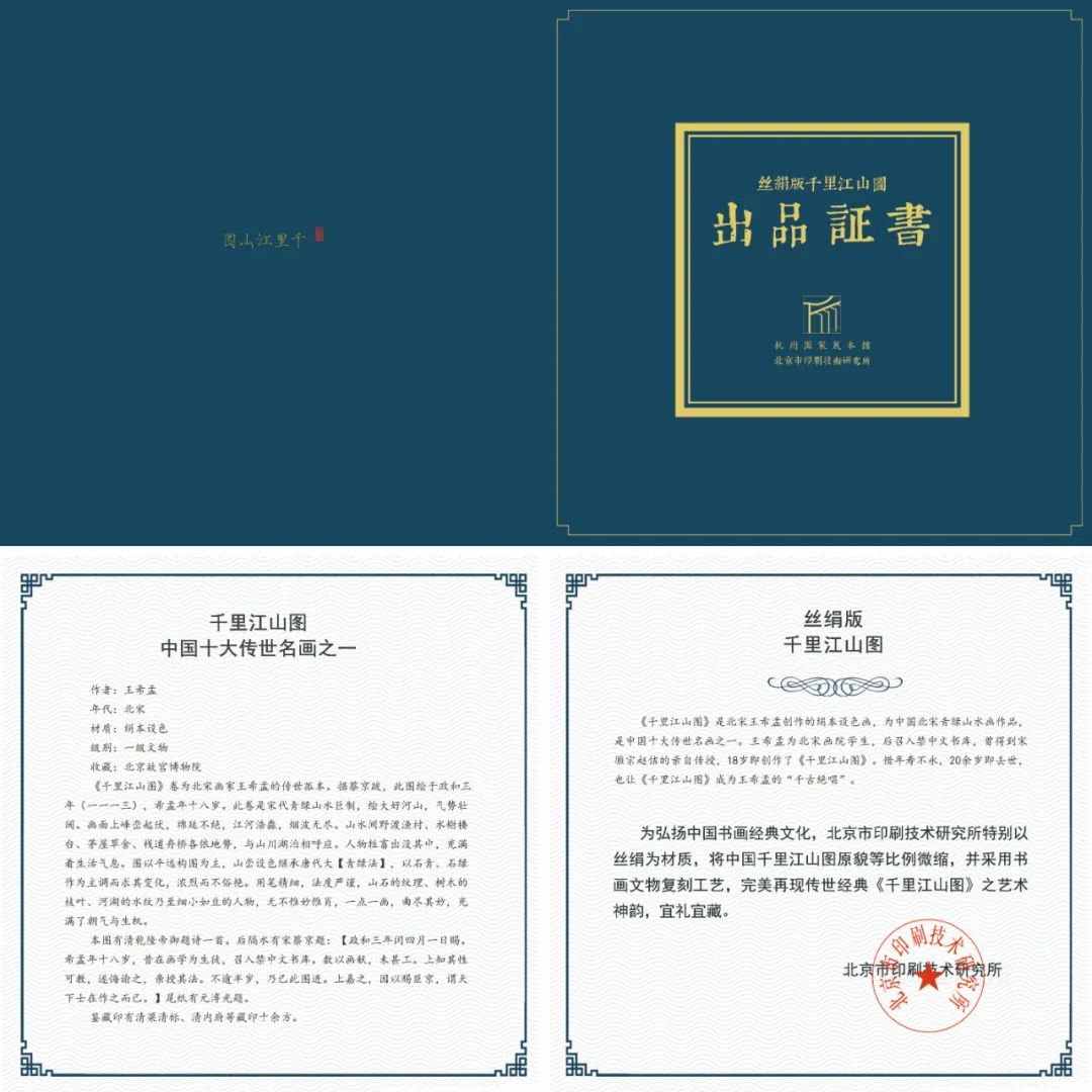 《千里江山图》高清丝绢复刻版卷轴每套都有出品证书,以及名画简介,一应俱全,保质保正。