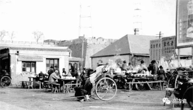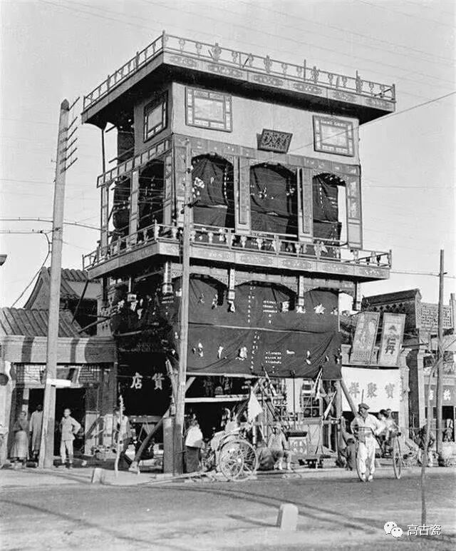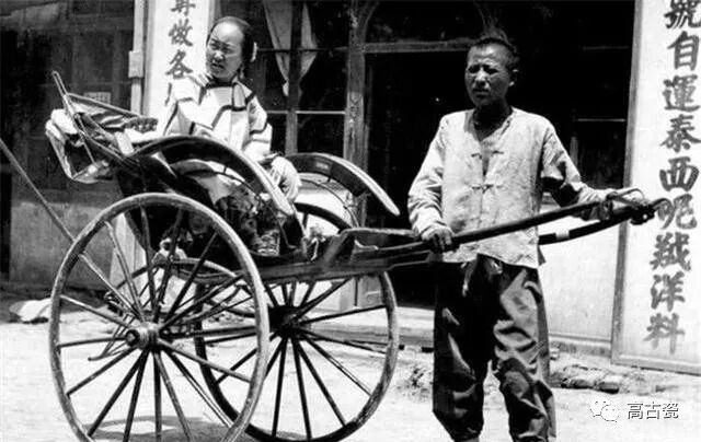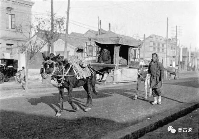 这张照片奇特就奇特在这辆驴车,竟然没有轱辘,前后各一批驴子,算是托着轿子走。马路旁的排水沟是明渠。