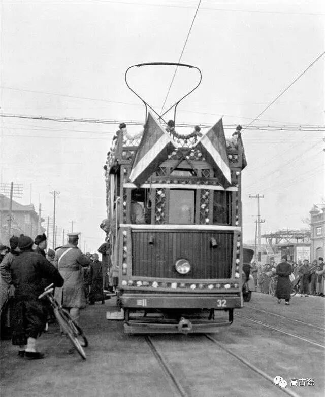插着国旗的有轨电车,行驶在北京前门大街上,行人纷纷让路。