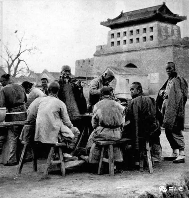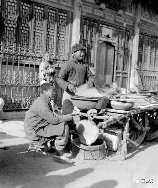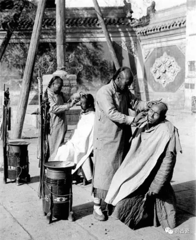 清末的剃头挑子,一头挑的是理发用具,一头挑着火炉和火盆。