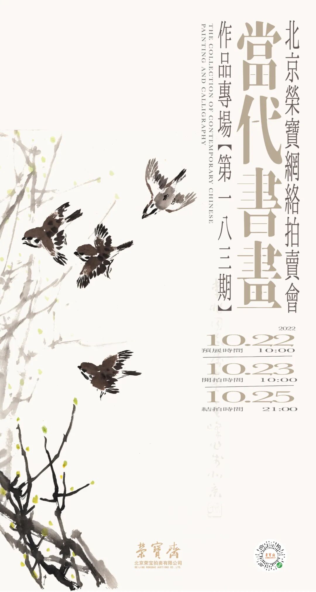 北京荣宝·当代书画作品专场网络拍卖会(第一八三期)将于10月22日10:00—10月23日10:00开启线上预展,并于10月23日10:00开拍,10月25日21:00结拍。