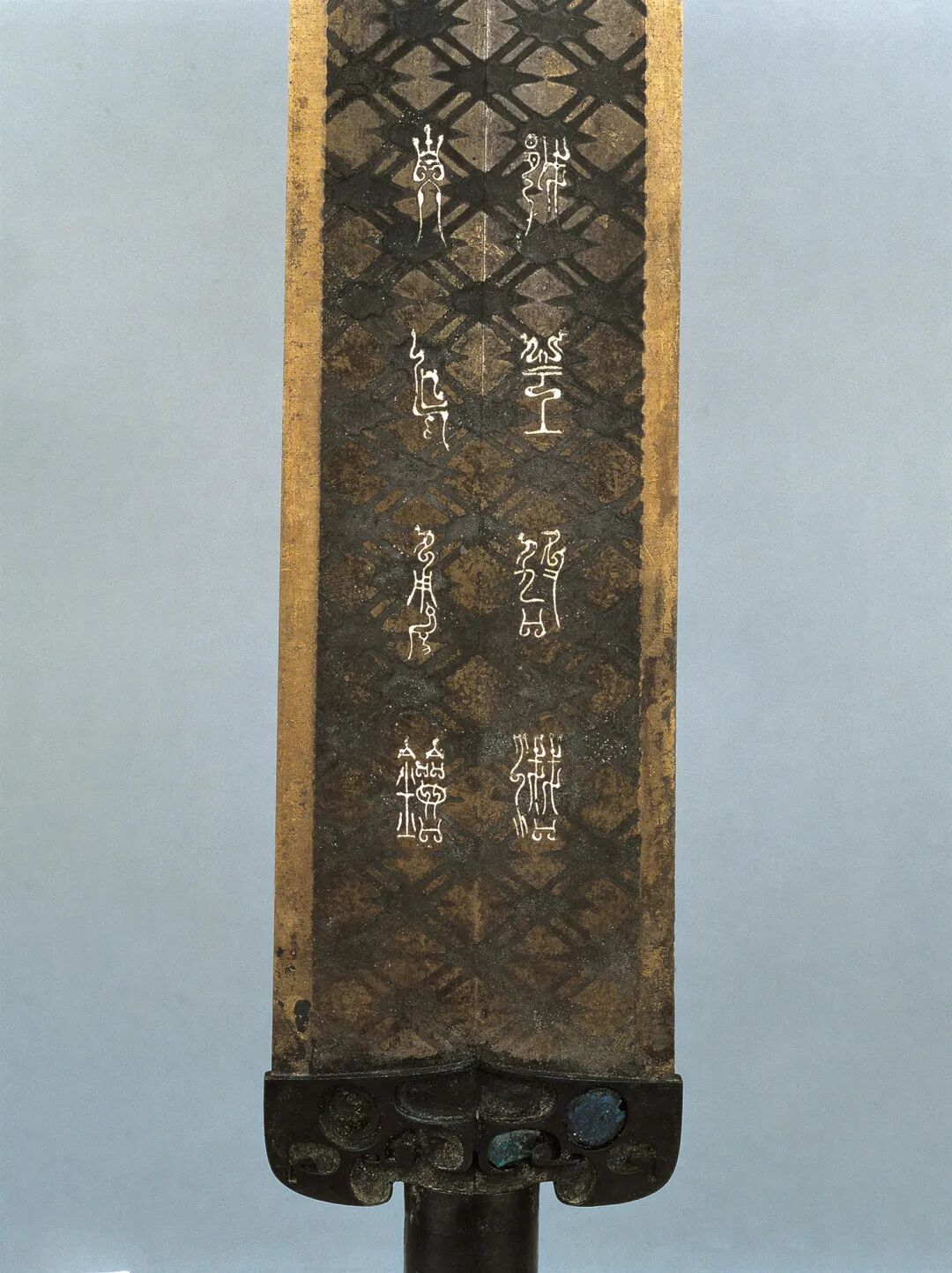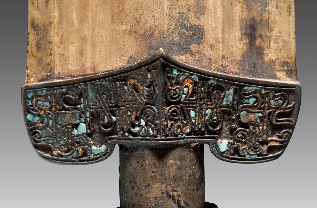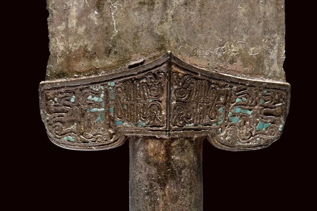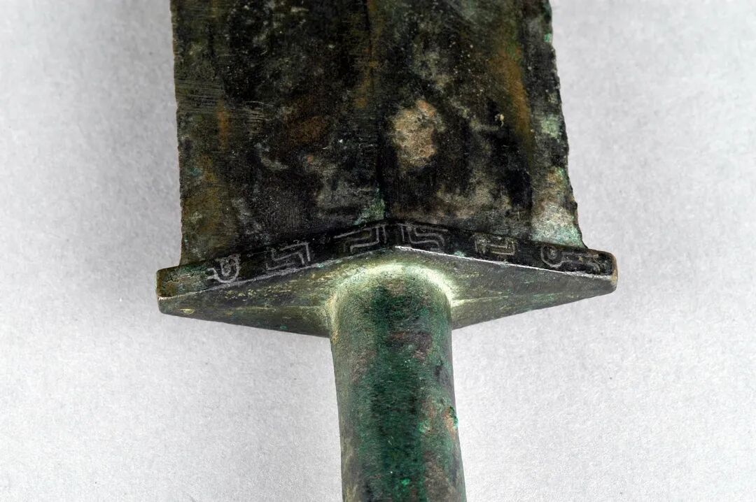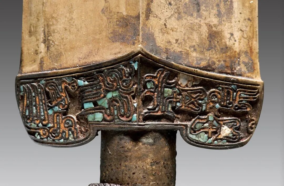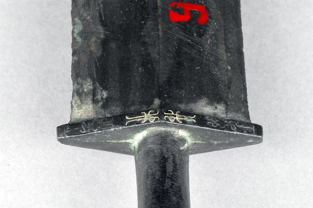 荆州博物馆的越王不光剑,荆州市张家山楚墓出土,通长65.3厘米,圆形剑首环列错金银铭文十二字,中空圆管型剑茎,无箍,菱形薄剑格两面各有错金铭文四字。