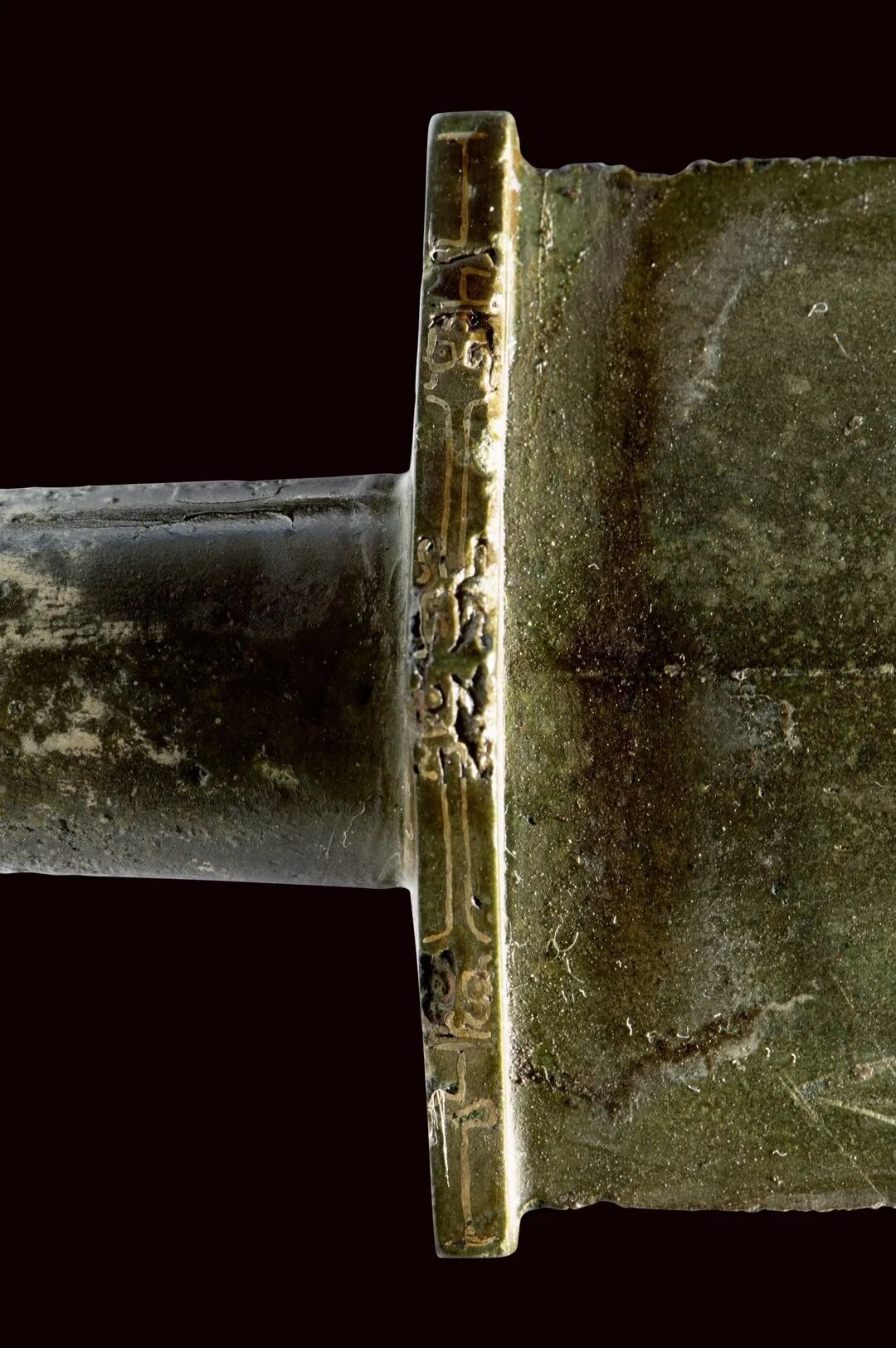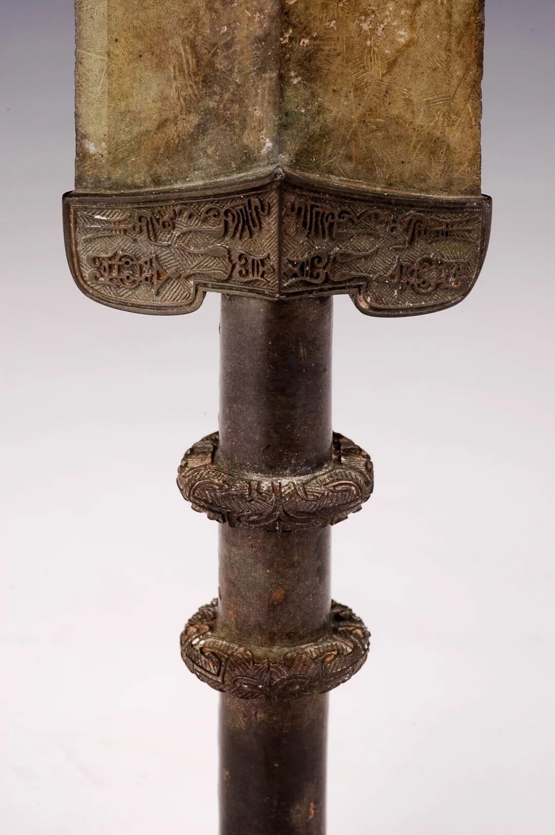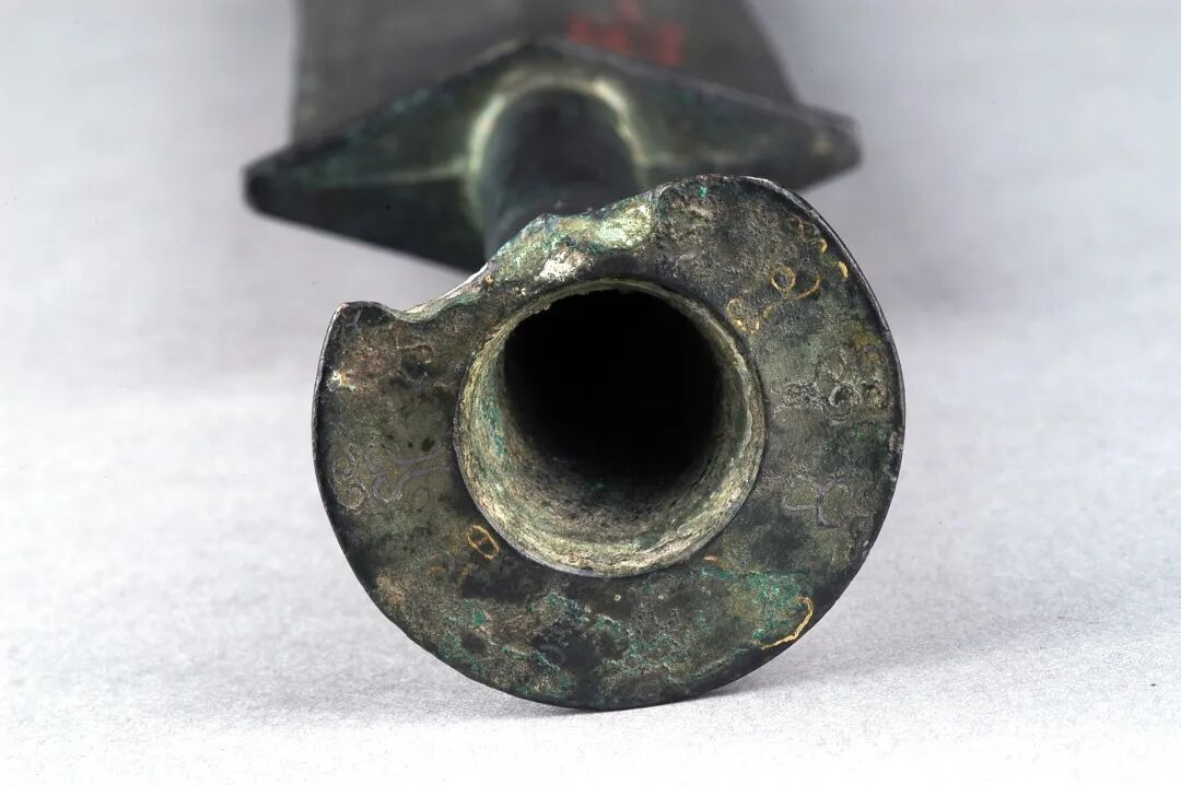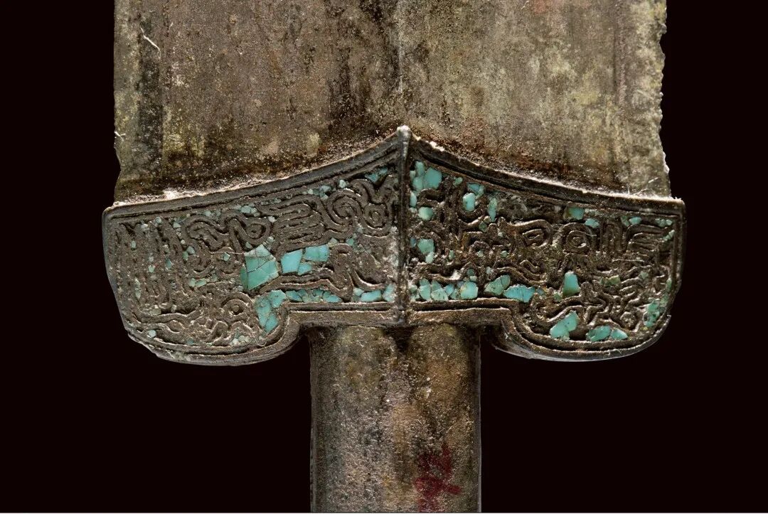 荆州博物馆的越王不光剑,荆州市张家山楚墓出土,通长65.3厘米,圆形剑首环列错金银铭文十二字,中空圆管型剑茎,无箍,菱形薄剑格两面各有错金铭文四字。