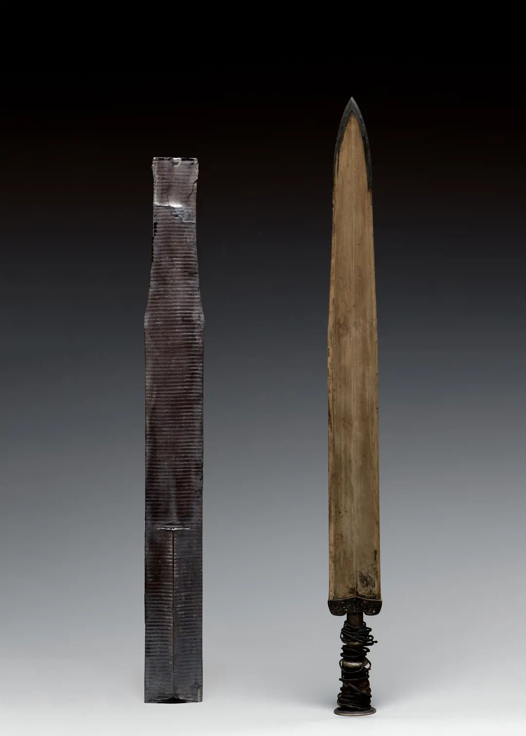 浙江省博物馆镇馆之宝之一的越王者旨於睗剑,1995年由杭州钢铁集团出资从香港购回。剑通长52.4厘米,圆盘形剑首,饰五道同心圆,剑茎上有两道椭圆形箍,剑首与剑格间缠绕丝质缠缑。凹字形宽剑格两面铸双钩鸟虫书铭文8字,正面为“戉(越)王戉(越)王”,反面为“者旨於睗”,字口间镶嵌绿松石,此剑还配有黑色漆木剑鞘。