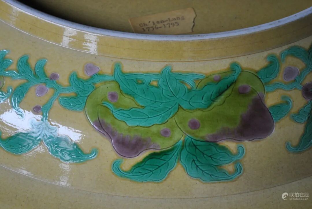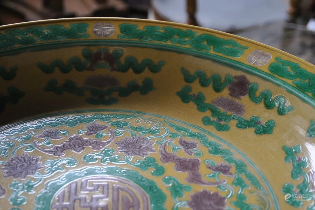 此盘直径为41厘米,通体以黄釉为底,盘中心处刻有寿字纹,环绕以五只蝙蝠,即五福捧寿,表达了多福多寿的美好祈愿。
