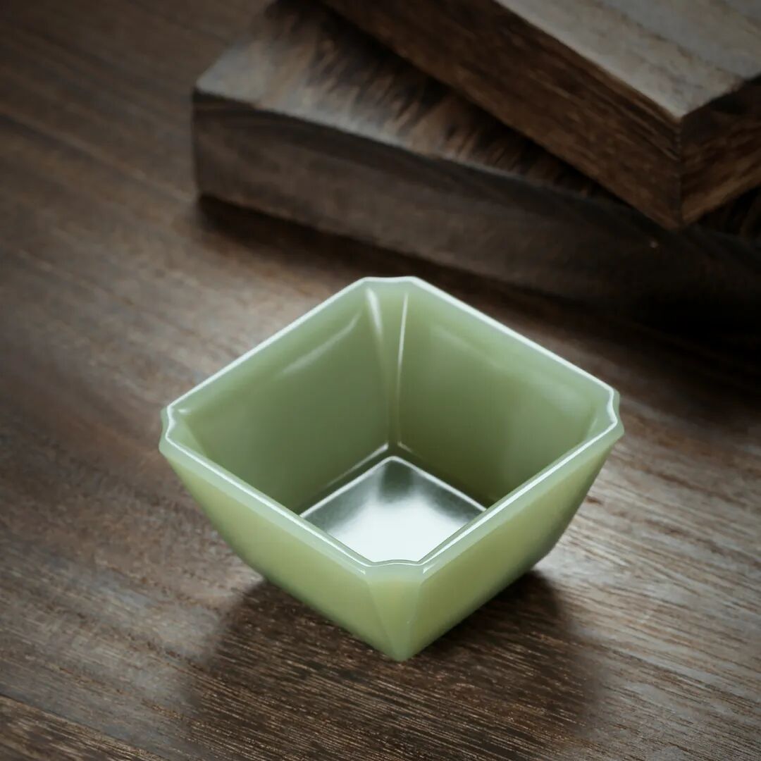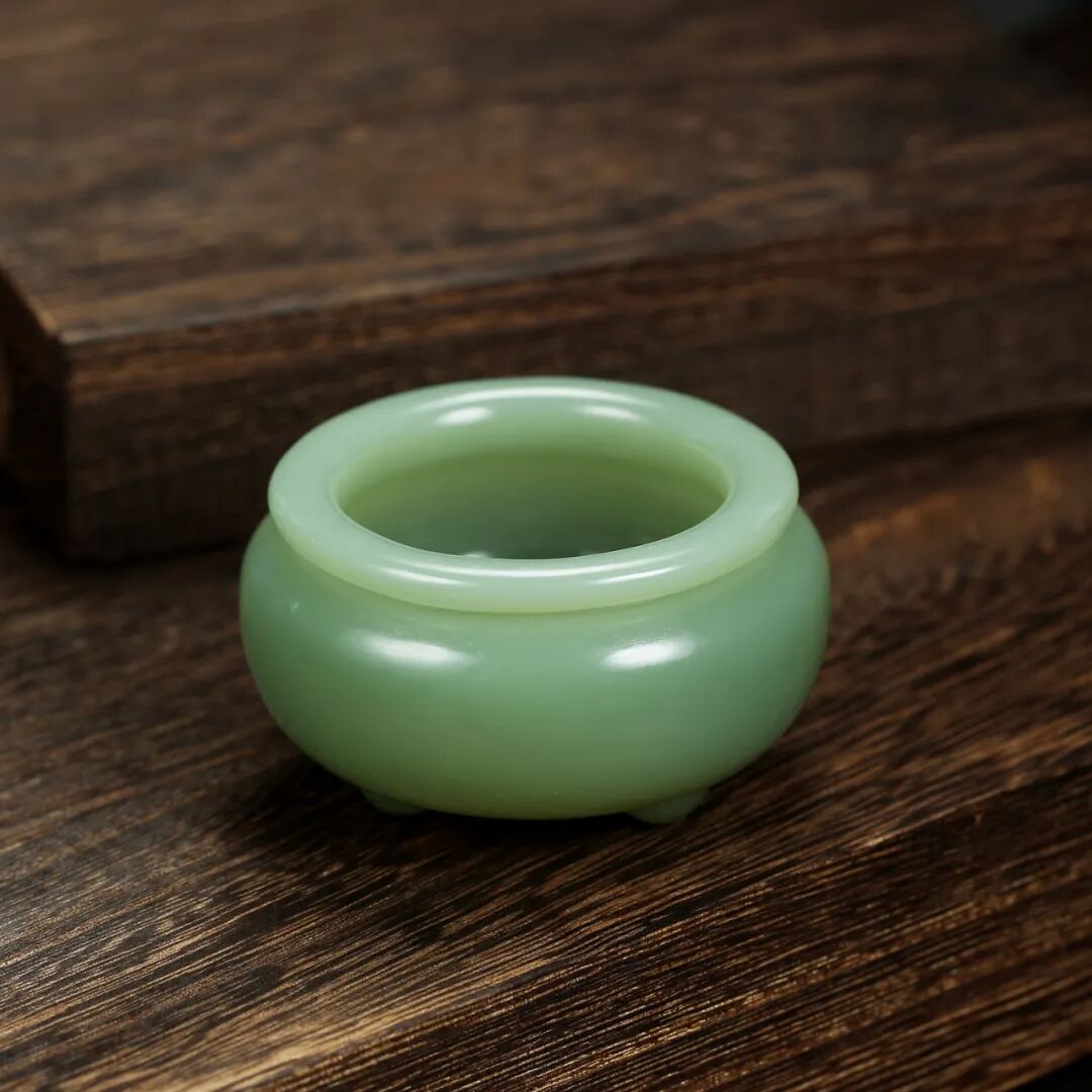 十三颗玉珠取和田青玉材质,玉质细腻,油性佳美,更为难得的是玉珠直径达到了18mm,富贵大气。中国玉雕大师张振兴通过金银错这种古老的工艺,将不同材质相结合,在如此狭小的弧面空间上绘制纹饰,进而开槽,将金丝嵌入粗细深浅一致的凹槽中,每颗玉珠上的纹饰精致严谨,丝毫不差。每颗念珠上均有错金六字真言,布局对称、工法严谨,色彩上,黄金的明丽与青玉的深沉彼此映衬又相互中和,呈现出庄重、高贵的气韵。本场的器皿类作品大多体量玲珑、造型简素、别具禅意,注重对玉料天然美感的彰显。许多器皿同时颇具实用价值,能够以低调朴素的姿态融入藏家们品茶、赏乐、会友的场合,让生活美学落地在点滴的时光中,熨帖心怀,慰藉神思。中国工艺美术大师苏然作品