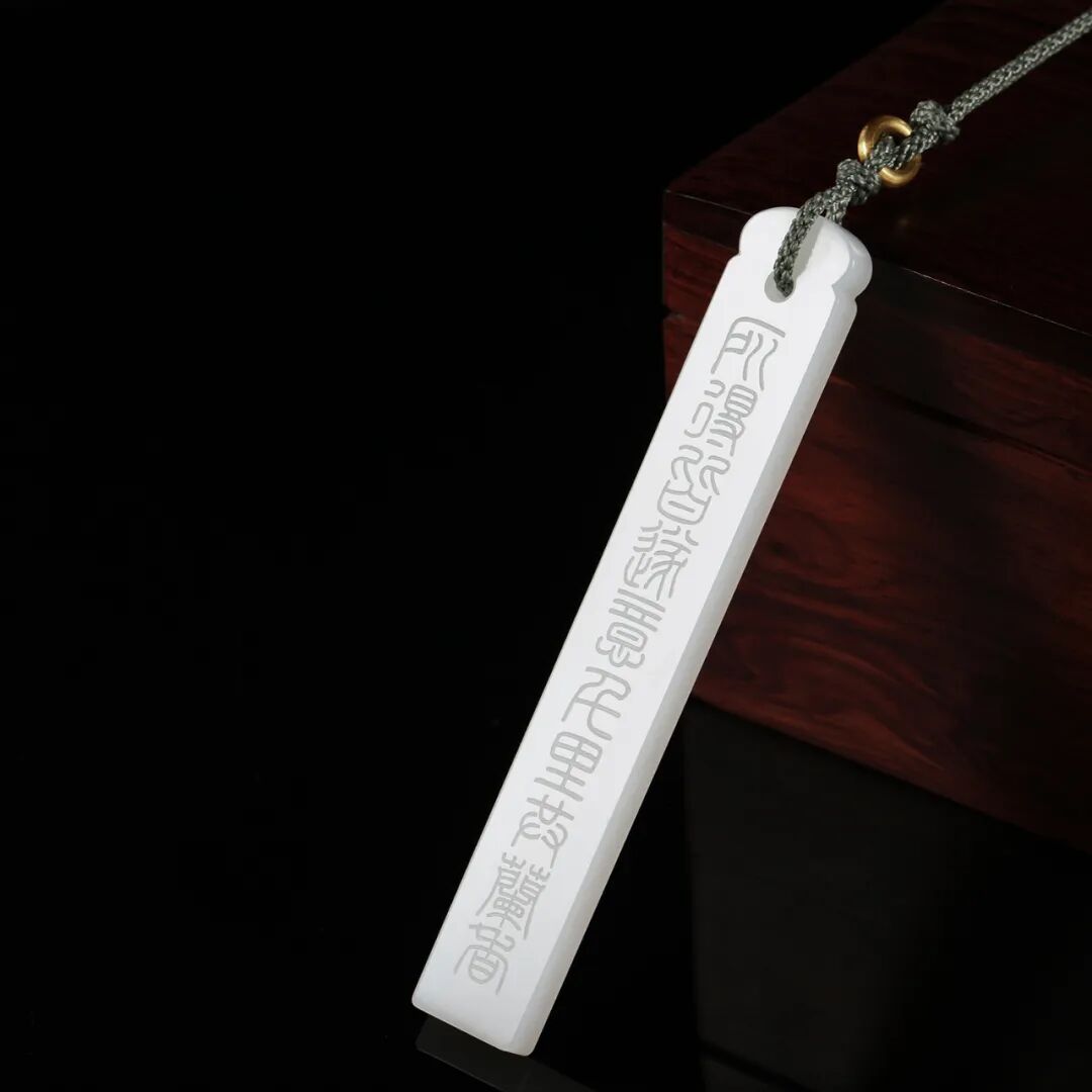 “福签”在祥瑞题材玉雕中无疑是一种新颖的表现形式。作品两面阴刻签文“福禄得安康,荣华保吉昌”“所得皆随意,千里共兰香”,为福禄卦,大吉。顶配金珠,具金声玉振之美。