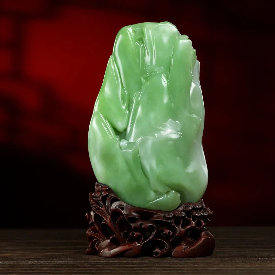 满翠的翠青玉料极为少见,中国玉石雕刻大师顾铭以卓越的造型技法在有限的玉料中生动呈现了山峦的巍峨与俊秀。青峰叠嶂中,一棵孤松、一座亭台、一帘瀑布、一只飞鹤,写意的表现手法将中国文人的隐逸情怀、山水志趣尽兴倾诉,余味悠长。