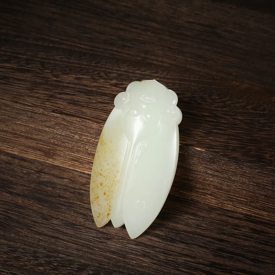这件玉蝉玉质极为细腻,且油性佳美,蝉翼处留有洒金皮色,与润美玉质相映成趣。中国玉石雕刻大师葛洪以汉八刀技法雕就玉蝉,并饰以博古纹饰,与西方的极简主义有异曲同工之妙。