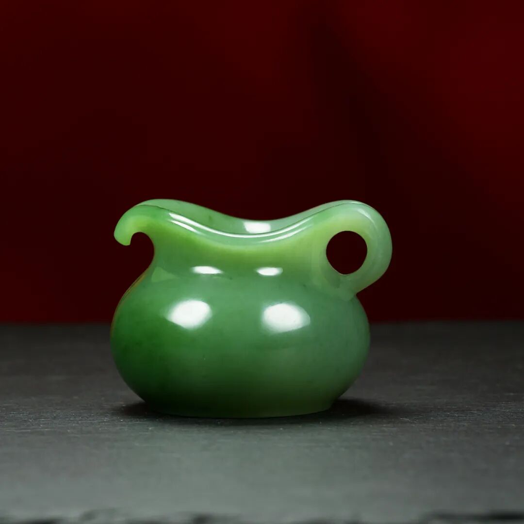 这件公道杯由罕见的七号矿碧玉老料雕琢而成,玉色明媚鲜翠,质地柔润匀实,妙不可言。作品器型圆融,杯口轮廓线条起伏有致,仿佛水波荡漾,灵动婉转。杯流似卷叶,平添一脉自然清新之韵,沁人心脾。