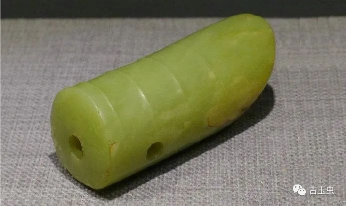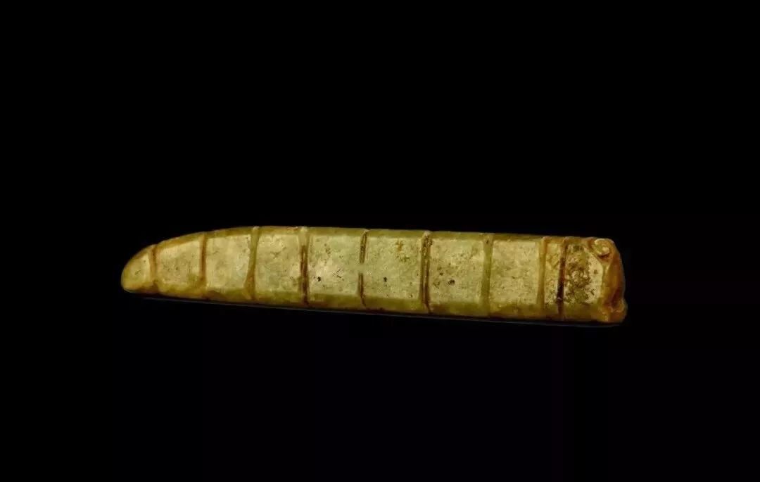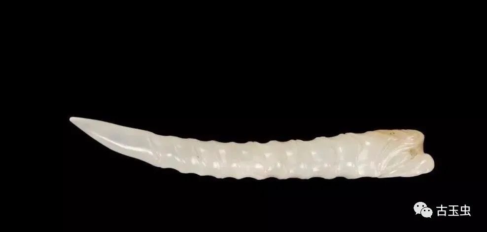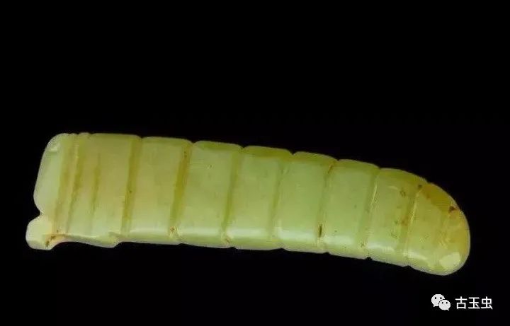 矩面直蚕形玉佩的截面为矩形,近首端顶部底部直角孔。蚕身平直,头方尾尖,多细长,在西周早期的关注古玉虫宝鸡茹家庄西周(弓鱼)国墓地和山东济阳刘台子墓葬中均有出土,风靡整个西周时期。
