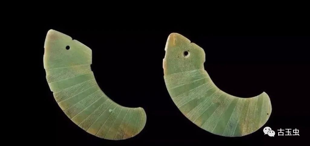 弯弓蚕形玉佩的截面近矩形,近首端顶部底部直角孔。蚕身呈弯弓形,蚕尾内卷。此类玉蚕较为常见,见于西周早期的宝鸡茹家庄西周(弓鱼)国墓地、山东济阳刘台子墓葬等