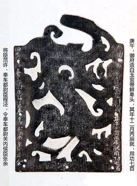 共计四十六字,内容为:“庚午,御府造白玉衮带鲜卑头,其年十二月丙辰就,用工七百”和“将臣范许、奉车都尉臣程泾、令奉车都尉关内侯臣张余”。