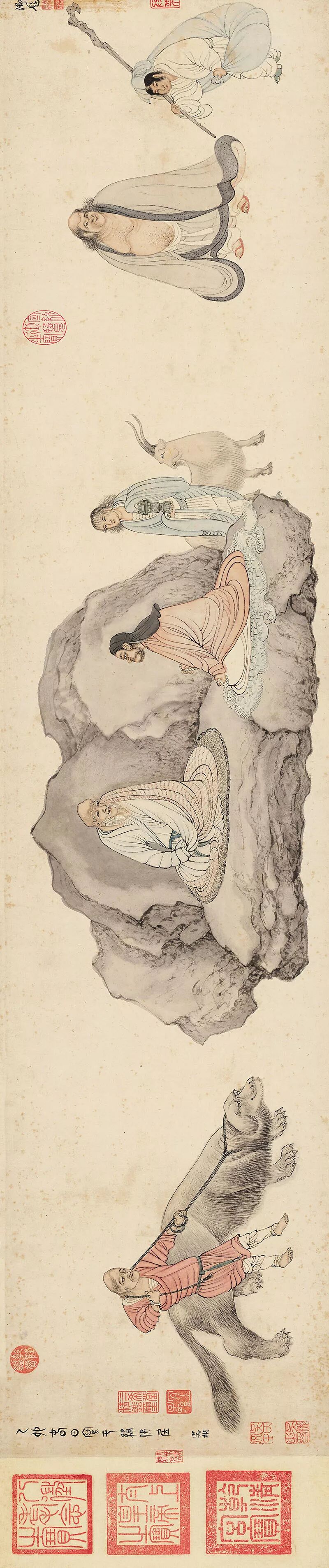 吴彬笔下的山水作品气势撼人,被学界誉为“不逊于宋代巨匠”。对于吴彬的研究,海外学界的重视程度远甚于国内。在西方,学者们对晚明绘画进行整理研究时,吴彬绘画中所表现出的特异图式自然地凸显出来。吴彬没有步文人画摹古的后尘,而是直抒心性。他的画风在当时颇具有前卫性,无论山水还是人物,都以极富个性的造型,以有别于传统的方式进行阐释。此卷《十八应真图》中的罗汉造型与吴彬其它传世作品,如《五百罗汉图》(今藏美国克利弗兰博物馆)、《十六应真图》(今藏美国纽约大都会艺术博物馆)和《画愣严二十五圆通册》(今藏台北故宫博物院)有着一致性,可谓“貌甚奇古”。